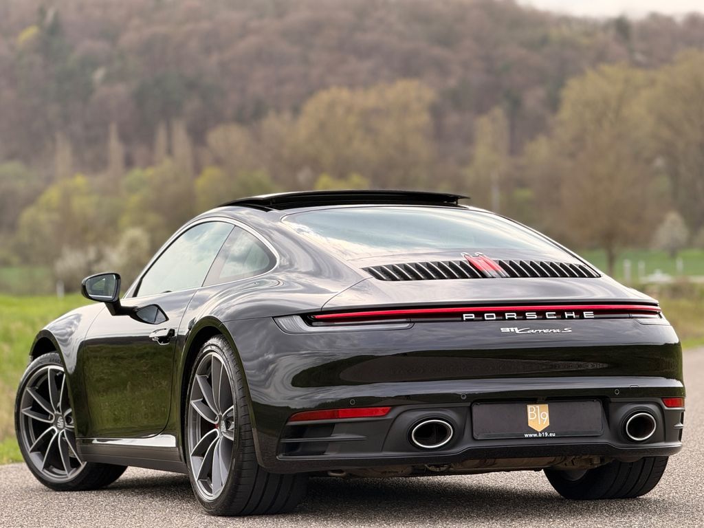 Der Porsche 911 Carrera S (992). Außen präsentiert er sich in elegantem Tiefschwarz, perfekt ergänzt durch die glanzgedrehte 20/21-Zoll Carrera Classic Radkombination, die seine sportliche Silhouette eindrucksvoll unterstreicht.