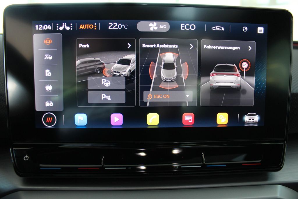 6 Lautsprecher, Ablagetasche an Vordersitzlehnen, Airbag Beifahrerseite abschaltbar, Airbag Fahrer-/Beifahrerseite, Akustischer Fußgängerschutz, Außensound (e-sound / AVAS), Antriebs-Schlupfregelung (ASR), Audio-Navigationssystem mit Touchscreen Farbbildschirm, Außenspiegel elektr. verstell-, heiz- und anklappbar mit Spiegelabsenkung, Außenspiegel grau, Blinkleuchten LED in Außenspiegel integriert, Bluetooth-Schnittstelle mit Freisprecheinrichtung integriert, Bordcomputer, Dachreling, Doppeltonhorn, Durchladeeinrichtung (Mittelarmlehne hinten), Einstiegsleisten beleuchtet, Elektron. Querdifferentialsperre (XDS), Fahrassistenz-System: Fahrprofilauswahl (SEAT Drive Profile), Fahrassistenz-System: Müdigkeitserkennung, Fahrassistenz-System: Spurhalteassistent, Fahrassistenz-System: Umfeldbeobachtungssystem (Front assist) mit City-Notbremsfunktion, Fensterheber elektrisch vorn + hinten mit Komfortschaltung, Gepäckraumabdeckung / Rollo, Handschuhfach beleuchtet, Heckleuchten Voll-LED mit dynamischem Lichtband (Infinite Light), Hybrid 150 kW (Motor 1,4 Ltr. - 110 kW TSI), Innenraumlicht-Paket LED, Isofix-Aufnahmen für Kindersitz, Karosserie: 5-türig, Klimaanlage Climatronic 3-Zonen, Kofferraumbeleuchtung, Kombiinstrument digital (virtual cockpit), Kopf-Airbag-System, Lendenwirbelstütze Sitz vorn links, verstellbar, Lendenwirbelstütze Sitz vorn rechts, verstellbar, Lenkrad (Sport/Leder) mit Multifunktion, Mobile Online Dienste Seat Connect, Nebelscheinwerfer LED mit Abbiegelicht, Notrufsystem, Otto-Partikelfilter (OPF), Parkbremse elektrisch mit Auto-Hold-Funktion, Radioempfang digital (DAB+), Reifen-Reparaturset, Reifenkontroll-Anzeige, Rücksitzlehne geteilt/klappbar (1/3-2/3), Rücksitzlehnen umklappbar mit Fernentriegelung im Kofferraum, Schadstoffarm nach Abgasnorm Euro 6d, Schalt-/Wählhebelgriff Leder, Seitenairbag, Seitenairbag vorn mitte (Central Airbag), Seitenscheiben hinten und Heckscheibe abgedunkelt, Sitz vorn links höhenverstellbar, Sitz vorn rechts höhenverstellbar, Sitzbezug / Polsterung: Stoff, Sport-Komfortsitze vorn, Start/Stop-Anlage, Steckdose (12V-Anschluß) im Koffer-/Laderaum, Steckdose (12V-Anschluß) vorn, Stoßfänger FR-Design, USB-Schnittstelle vorn (2-fach, Typ C), Verzurrösen Koffer-/Laderaum, Warnanlage für Sicherheitsgurt-System, Wärmeschutzverglasung, Zentralverriegelung / Startanlage Keyless Go (Start-Stop-Knopf)