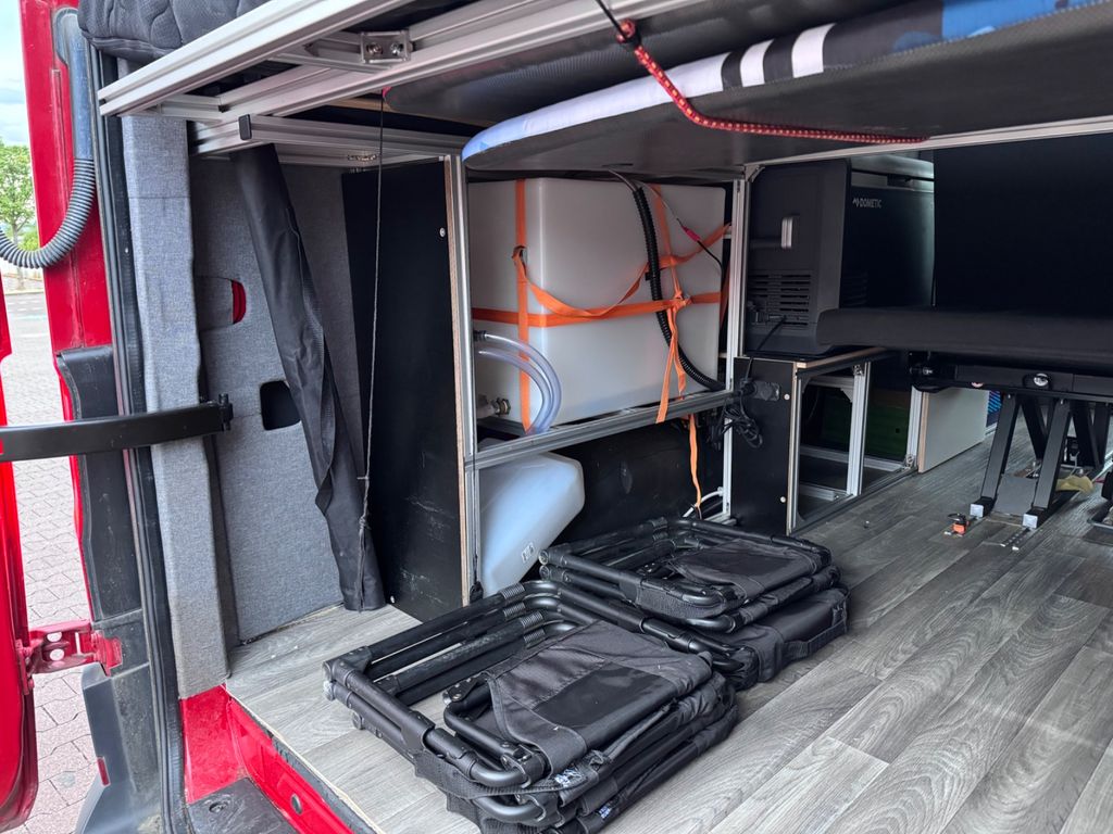 Schlafplätze für 4 Personen. Querbett hinten ohne Verbreiterung, also passt gut für die Personen bis ca 170cm. Einige Details müssen noch für die Zulassung fertiggestellt werden.