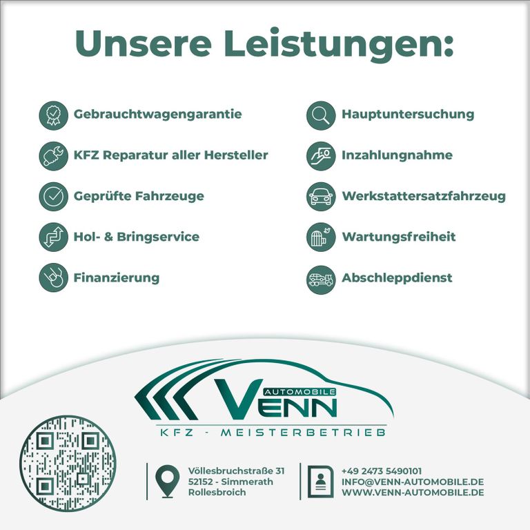 Willkommen bei Venn Automobile - Ihrem vertrauenswürdigen Experten für ausgewählte Gebrauchtwagen. In der Städteregion Aachen bieten wir Ihnen Fahrzeuge, die durch ihre Qualität und Zuverlässigkeit überzeugen. Jedes Auto in unserem Sortiment wird sorgfältig geprüft, um Ihnen einen hohen Standard an Sicherheit und Fahrkomfort zu gewährleisten. Profitieren Sie von:- Verlängerten Garantien von bis zu 60 Monaten (gegen Aufpreis)