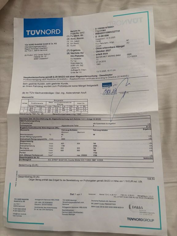 TÜV NEU: Die Hauptuntersuchung wurde im Oktober 2025 bei TÜV NORD ohne erkennbare Mängel bestanden (nächster TÜV erst Oktober 2027).