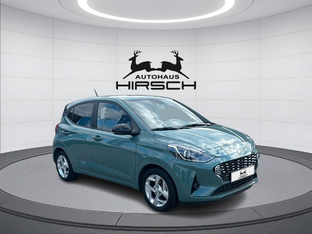 Dieser gepflegte Hyundai i10 aus 2023 präsentiert sich in ansprechendem Grün-Metallic und überzeugt mit umfangreicher Ausstattung. Der Kleinwagen mit Frontantrieb wurde in Deutschland ausgeliefert und hatte nur einen Vorbesitzer. Mit seinem 3-Zylinder Benzinmotor (998 ccm, 67 PS) und manuellem Getriebe bietet er eine sparsame und agile Fahrweise. Die manuelle Klimaanlage, beheizbare Sitze und das beheizte Lenkrad sorgen für Komfort in jeder Jahreszeit. Der i10 verfügt über moderne Sicherheitssysteme wie Spurhalteassistent, Kollisionsvermeidung und Verkehrszeichenerkennung. Das Infotainmentsystem mit Touchscreen, Navigation, Apple CarPlay und Android Auto lässt keine Wünsche offen. Dank Scheckheft-gepflegter Historie und Hyundai Promise Siegel erhalten Sie ein zuverlässiges Fahrzeug mit Garantie.- Grüne Metallic-Lackierung mit schwarzem Stoffinterieur