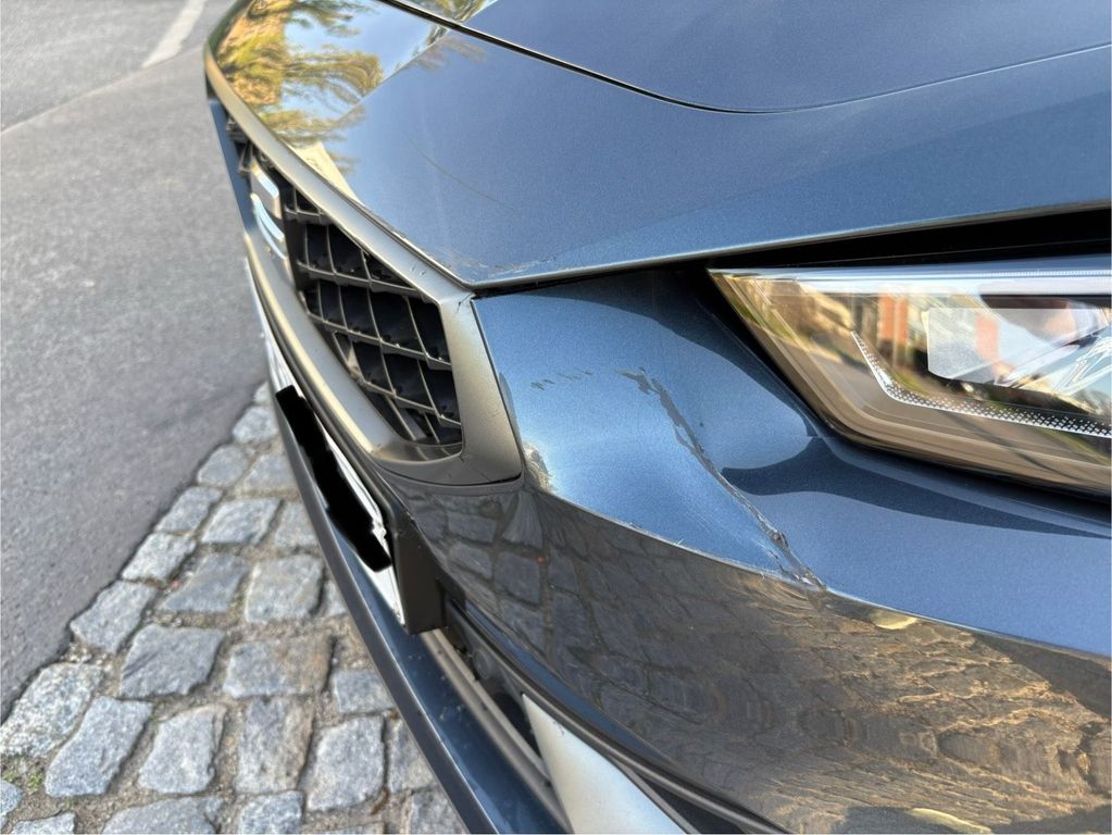 An der Frontstoßstange ist ein Kratzer, der durch ein anderes Fahrzeug verursacht wurde beim Einbiegen in eine Einfahrt verursacht wurde