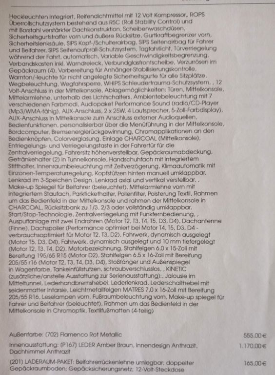 Einzelbesitzer (nach Tageszulassung 11/2016); Scheckheft; TÜV + AU immer ohne Mängel; letzte Prüfung 02/2026, nächste fällig 02/2028. Letzter Service 02/2026 mit Ölwechsel und Ölfilterwechsel (immer CASTROL EDGE, V 0W-20); Extras: Außenfarbe: Flamenco Rot Metallic; Leder Amber Braun, Innendesign Anthrazit, Dachhimmel Anthrazit; Laderaum-Paket: Beifahrerrückenlehne umlegbar; doppelter Gepäckraumboden; 12-Volt-Steckdose; Winter-Paket: Sitzheizung vorn; Frontscheibenheizung; Tempomat; Mittelarmlehne einstellbar; Panorama-Glasdach mit Sonnenschutz; neue VARTA 12V 70Ah.Jetzt die Punkte, die zur Preisgestaltung auf 8.900 € geführt haben: EU-Import; von 04/2018 bis 02/2020 mit externer DTE-PowerBox, Start-Stopp-deaktiviert (bewusst); Motorhaubensensor zeigt sporadisch eine Fehlermeldung an, obwohl die Haube korrekt geschlossen ist. Reparierter Unfallschaden 05/2020 - fachgerechte Reparatur und Lackierung (Rechnung liegt vor). Einige Lackstellen und leichte Kratzer (siehe Fotos).