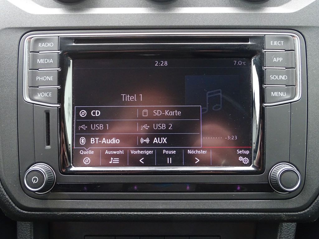 Sonderausstattung:App-Connect und 2 USB-Anschlüsse (iPhone / iPod) mit AUX-IN, Audiosystem Composition Media (Touchscreen, Radio/CD-Player, MP3, Bluetooth), Ausstattungs-Paket: Licht + Sicht, Außenspiegel elektr. anklappbar, Dachreling, Einparkhilfe hinten inkl. Rückfahrkamera, Funkschlüssel (2) klappbar, Gepäckraum-Abtrennung (Netztrennwand), Klimaanlage Climatronic 2-Zonen, LM-Felgen, Multifunktionsanzeige Plus und Müdigkeitserkennungs-Sensor, Reserverad in Fahrbereifung (Stahl), Seitenfenster im Lade-/Fahrgastraum vorn links, schiebbar, Seitenfenster im Lade-/Fahrgastraum vorn rechts, schiebbar, Sitze vorn höhenverstellbar mit Schubladen, Sitzheizung vorn, Stoßfänger Wagenfarbe, Verglasung hinten abgedunkelt (74 %)