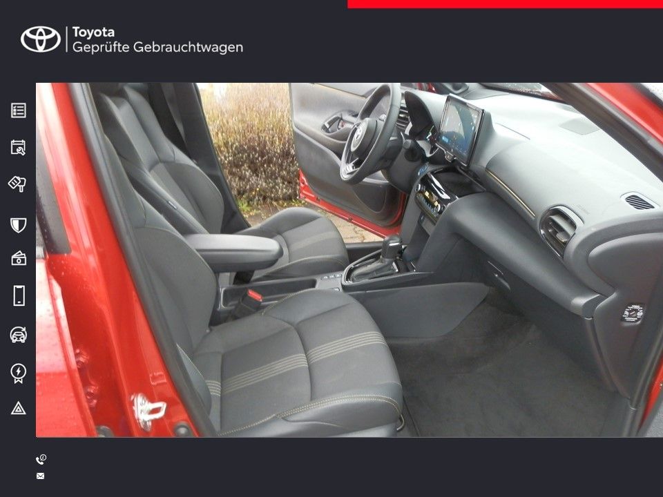 Ablagetasche an Vordersitzlehnen, Airbag Fahrer-/Beifahrerseite, Aktive Kopfstützen vorn, Ambiente-Beleuchtung vorn (LED), Audiobedienung am Lenkrad, Audiosystem TAS600 (Toyota Smart Connect), Autom. Begleitfunktion der Beleuchtung (Follow me home, FMH), Außenspiegel elektr. anklappbar, Außenspiegel elektr. verstell- und heizbar, Bremsassistent, Cargo-Paket, Dachantenne, Dachreling, Elektr. Bremskraftverteilung, Fahrassistenz-System: Berganfahrkontrolle (HAC), Fahrassistenz-System: Eco-Anzeige für verbrauchsoptimiertes Fahren, Fahrassistenz-System: Fernlichtassistent (Abblendautomatik Fahrlicht, AHB), Fahrassistenz-System: Müdigkeitserkennungs-Sensor, Fahrassistenz-System: Pre-Collision-System (PCS), Fahrassistenz-System: Sicherheitssystem Toyota Connect mit automatischem Notruf (eCall), Fahrassistenz-System: Spurhalteassistent (LDA), Fahrassistenz-System: Verkehrszeichenerkennung (RSA), Fensterheber elektrisch vorn + hinten, Heckleuchten LED, Heckspoiler, Hybrid 85 kW (Motor 1,5 Ltr. - 68 kW), Induktionsladeschale für Smartphone, Innenraumfilter: Staub- und Pollenfilter mit Aktivkohlefilter, Innenspiegel mit Abblendautomatik, Isofix-Kindersitz-System, Karosserie: 5-türig, Kindersicherung elektr. betätigt, Klimaautomatik 2-Zonen, Kopf-Airbag-System, Kopfstützen hinten, Lendenwirbelstütze Sitz vorn links, elektr. verstellbar, Lenksäule (Lenkrad) verstellbar, LM-Felgen, Nebelscheinwerfer LED, Park-Assistent mit Rückfahrkamera, Parkbremse elektrisch (EPB), Radstand 2560 mm, Reifen-Reparaturkit, Reifendruck-Kontrollsystem, Schadstoffarm nach Abgasnorm Euro 6d, Schalt-/Wählhebelgriff Leder, Seitenairbag vorn, Seitenscheiben hinten und Heckscheibe dunkel getönt (Privacy Glass), Service-System: MyT-Connected Services, Sitz vorn links höhenverstellbar, Sitz vorn rechts höhenverstellbar, Sitzbezug / Polsterung: Stoff/Leder, Smart Connect-Paket, Sonnenblenden mit Spiegel (beleuchtet), Steckdose (12V-Anschluß) in Mittelkonsole, Steckdose (12V-Anschluß) Koffer-/Laderaum, Stoßfänger Wagenfarbe, Türgriffe außen Wagenfarbe, Unterfahrschutz hinten, Unterfahrschutz vorn, Verglasung hinten abgedunkelt, Warnanlage für Sicherheitsgurte hinten, Warnanlage für Sicherheitsgurte vorn, Winter-Paket, JBL Soubdsystem