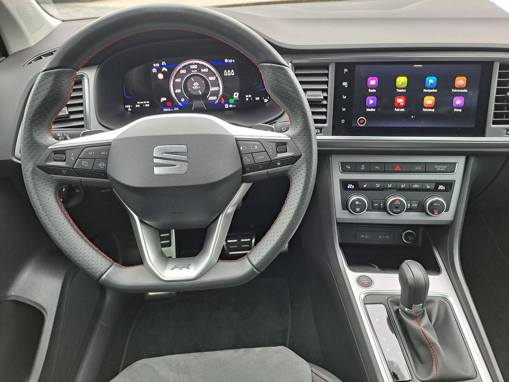 3. Bremsleuchte, 8 Lautsprecher, Ablagetasche an Vordersitzlehnen, Airbag Beifahrerseite abschaltbar, Airbag Fahrer-/Beifahrerseite, Antriebs-Schlupfregelung (ASR), Außenspiegel elektr. verstell-, heiz- und anklappbar mit Spiegelabsenkung, Außenspiegel grau, Blinkleuchten LED in Außenspiegel integriert, Bluetooth-Schnittstelle mit Freisprecheinrichtung integriert, Bordcomputer, Brillenfach, Dachreling, Doppeltonhorn, Einstiegsleisten beleuchtet, Elektron. Querdifferentialsperre (XDS), Fahrassistenz-System: Berganfahr-Assistent (Hill-Holder), Fahrassistenz-System: Fahrprofilauswahl (SEAT Drive Profile), Fahrassistenz-System: Müdigkeitserkennung, Fahrassistenz-System: Spurhalteassistent, Fahrassistenz-System: Umfeldbeobachtungssystem (Front assist) mit City-Notbremsfunktion, Fahrassistenz-System: Verkehrszeichenerkennung, Fensterheber elektrisch vorn + hinten mit Komfortschaltung, Gepäckraumabdeckung / Rollo, Handschuhfach beleuchtet, Heckleuchten LED mit dynamischem Blinklicht, Heckspoiler Wagenfarbe, Innenraumlicht-Paket LED, Isofix-Aufnahmen für Kindersitz, Karosserie: 5-türig, Klimaanlage Climatronic 2-Zonen, Knieairbag Fahrerseite, Kofferraumbeleuchtung, Kombiinstrument digital (virtual cockpit), Kopf-Airbag-System, Lendenwirbelstütze Sitz vorn links, verstellbar, Lendenwirbelstütze Sitz vorn rechts, verstellbar, Licht- und Sicht-Paket, LM-Felgen, Mittelarmlehne hinten, Mittelkonsole vorn mit Mittelarmlehne, Becherhalter, Ablagebox und Luftausströmer hinten, Modellpflege, Motor 1,5 Ltr. - 110 kW 16V TSI ACT, Nebelscheinwerfer LED mit Abbiegelicht, Notrufsystem, Otto-Partikelfilter (OPF), Parkbremse elektrisch mit Auto-Hold-Funktion, Pedale Aluminium-Design, Radstand 2638 mm, Reifen-Reparaturset, Reifenkontroll-Anzeige, Rückfahrkamera, Rücksitzlehne geteilt/klappbar (1/3-2/3), Schadstoffarm nach Abgasnorm Euro 6e, Schalt-/Wählhebelgriff Leder, Scheinwerfer Voll-LED, SEAT Media-System Plus, Seitenairbag, Seitenscheiben hinten und Heckscheibe abgedunkelt, Sitz vorn links höhenverstellbar, Sitz vorn rechts höhenverstellbar, Sonnenblende links mit Spiegel (beleuchtet), Sonnenblende rechts mit Spiegel (beleuchtet), Start/Stop-Anlage, Stau-/Ablagefach unter Sitz vorn links, Steckdose (12V-Anschluß) vorn, Stoßfänger FR-Design, USB-Ladeanschlüsse (2-fach, Typ C) für 2.Sitzreihe, Verzurrösen Koffer-/Laderaum, Wärmeschutzverglasung