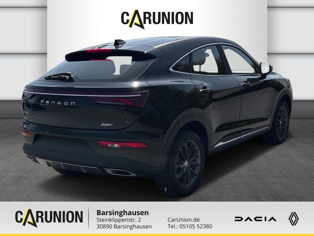 Steuerung-Bedienung ?¤? Automatik CVT ?¤? ABS-Anti Blockier System ?¤? EBD-elektronische Bremskraftverteilung ?¤? ESP-elektronische Bremskraftverteilung ?¤? PEPS ?¤? EBA-elektronischer Bremsassistent ?¤? TCS-Tractions Control System ?¤? HAC-Berganfahrhilfe ?¤? HDC-Bergabfahrkontrolle ?¤? Auto-Hold ?¤? automatische Türverriegelung ?¤? Zentralverriegelung mit Fernbedienung ?¤? Komfortöffnung der Fenster und Panoramadach über Fahrzeugschlüssel ?¤? Smart Key ?¤? Keyless Entry ?¤? Keyless Start ?¤? Wischintervall ?¤? Regensensor ?¤? Scheibendefroster ?¤? Geschwindigkeitswarner ?¤? Müdigkeitserinnerung Sicherheit ?¤? RDKS-Reifendruck-Kontrollsystem ?¤? Fahrer / Beifahrerairbag / Seitenairbag ?¤? 3 Punkt Sicherheitsgurte ?¤? Gurtwarner ?¤? elektronische Motorüberwachung ?¤? Anti Theft Alarmsystem ?¤? Kindersicherung ?¤? Isofix ?¤? Dashcam Exterieur ?¤? elektrisch verstellbare Außenspiegel ?¤? 18 Zoll Aluminiumräder 235/50 R18 ?¤? Reserverad / Notrad 165/80 R17 ?¤? Haifischantenne ?¤? PDC vorn / hinten ?¤? Heckscheibenwischer ?¤? Rückfahrkamera ?¤? beheizbare Heckscheibe ?¤? beheizbare Außenspiegel ?¤? Panoramaglasschiebedach ?¤? elektrische Heckklappe ?¤? elektrische Tankklappe ?¤? Autotür-Welcome-Logo-Projektion ?¤? Motorabdeckung Interieur ?¤? Rückspiegel mit Indikator LED ?¤? elektrische Fensterheber vorn / hinten ?¤? Sonnenblenden mit Spiegel und Beleuchtung ?¤? Mittelarmlehne vorn mit Ablagefach ?¤? Handschuhfach gepolstert ?¤? Haltegriffe ?¤? Sportsitze ?¤? beheizbare Vordersitze Fahrersitz 10-fach elektrisch verstellbar ?¤? Beifahrersitz 4-fach elektrisch verstellbar ?¤? 3-Speichen Lederlenkrad ?¤? Multifunktionslenkrad in Höhe und Tiefe verstellbar ?¤? Rücksitze geteilt (60/40) umklappbar inkl. Mittelarmlehne mit Becherhaltern ?¤? 2 X 12V Outlet ?¤? Zigarettenanzünder ?¤? Innenbeleuchtung mit Verzögerung aus ?¤? hochwertige Kunstlederausstattung ?¤? elektrische Parkbremse ?¤? Dachhimmel Anthrazit Entertainment und Cockpit ?¤? Pointer Instrument ?¤? Geschwindigkeitsregelanlage mit Limiter ?¤? Radio / USB / AUX / Bluetooth ?¤? Navigationssystem mit westeuropäischem Kartenmaterial ?¤? 10.25 Zoll Display ?¤? 6 Lautsprecher Beleuchtungskonfiguration ?¤? LED Scheinwerfer ?¤? Lichtsensor ?¤? durchgehende LED Heckleuchte ?¤? dynamische Blinkleuchten vorn / hinten ?¤? Abbiegelicht ?¤? Nebelscheinwerfer Klimatisierung und Lüftung ?¤? Klimaanlage mit Mikrofilter . *Technische Daten DFSK Fengon 5 Parameter 1,5L Turbo, Leistung 101 kW, 4 Zylinder, 4 Takt, Euro 6d, Wassergekühlt, Benzin, CVT Getriebe, Drehmoment 220 Nm/4000 Höchstgeschwindigkeit 180 km/h L/B/H in mm 4685/1865/1645 Bodenfreiheit 200 mm Wendekreis Radius 11 m Achslast vorne 1061 Kg Achslast hinten 1004 Kg Kofferraum Länge 1080 mm - 1950 mm Kofferraumvolumen 379 L - 796 L Leergewicht 1665 Kg Gesamtgewicht 2065 Kg Sitze 5 Aluminiumräder 235/50R18 oder 245/45R19 Radstand 2790 mm Spur vorn/hinten in mm 1580/1570 Anhängelast 1500 Kg Tankinhalt 58 L Kraftstoffverbrauch und Energieeffizienz Verbrauch kombiniert - WLTP 9,9L / 100 km CO2 - Emission kombiniert - WLTP 224 g/km Energieeffizienzklasse F Auf Grundlage der gemessenen CO2 - Emission unter Berücksichtigung der Masse des Fahrzeugs ermittelt. Abgasnorm Euro 6d *Abweichungen durch den Hersteller möglich.