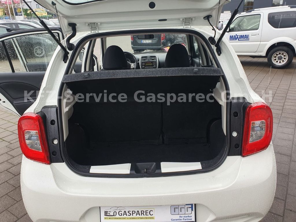 Airbag Beifahrerseite abschaltbar, Airbag Fahrer-/Beifahrerseite und Seitenairbag vorn, Außenspiegel elektr. verstellbar, Außenspiegel Wagenfarbe, Bremsassistent (Nissan Brake-Assist), Comfort-Paket, Dachspoiler, Fernentriegelung Tankklappe, Frontscheibe Verbundglas, Gepäckraumabdeckung / Rollo, Heckscheibe heizbar, Innenspiegel abblendbar, Isofix-Aufnahmen für Kindersitz, Karosserie: 5-türig, Kopf-Airbag-System, Kopfstützen hinten verstellbar (links/rechts und mitte), Lenksäule (Lenkrad) höhenverstellbar, Leseleuchte vorn, Modellpflege, Motor 1,2 Ltr. - 59 kW KAT, Reifendruck-Kontrollsystem, Reserverad als Notrad, Rücksitz geteilt/klappbar, Schadstoffarm nach Abgasnorm Euro 6, Schalt-/Wählhebelgriff Leder, Schaltpunktanzeige, Sitz vorn links höhenverstellbar, Sitzbezug / Polsterung: Stoff, Sonnenblenden mit Spiegel, Steckdose (12V-Anschluß) in Mittelkonsole, Stoßfänger Wagenfarbe, Türverkleidung mit Stoffeinsatz, Verglasung getönt