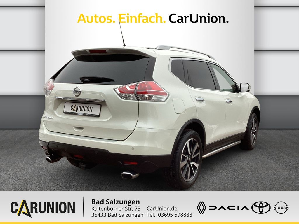 ABS m. elektr. Bremskraftverteilung, ALL MODE 4x4-i System, Airbag Fahrer- und Bei.seite"Full-Size", Airbag: Kopfairbags vorn und hinten, Airbag: Seitenairbags, Aktive Fahrkomfortregelung, Aktive Spurkontrolle, Anhängerkupplung abnehmbar, Außenspieg.el.anklapp-einstell-beheizbar, Berganfahrassistent, Bluetooth-Schnittstelle, Freisprecheinr, Dieselpartikelfilter, Doppelauspuff, Dritte Bremsleuchte, Einparkhilfe vorne und hinten, Einstiegsleisten beleuchtet, Elektronische Parkbremse, Elektronisches-Stabilitäts-Programm ESP, Fahrerinformationssystem, Fahrtlichtautomatik, Fensterheber elektrisch vorn und hinten, Flexi-Board: Modulares Verstausystem, Friendly Lightning, Geschwindigkeitsregela.mit Speed Limiter, Getriebe: 6-Gang-Schaltung, Grundausstattung X-Trail, Heckscheibenwischer, ISOFIX Kindersitz Befestigungspunkte, Innenspiegel, automatisch abblendend, Kantenschutz & Matten & Kofferraummatte, Kindersicherung hinten, Klimaautomatik (2-Zonen), Kopfstützen (5), höhenverstellbar, LED-Tagfahrlicht, Lackierung: Perleffekt, Laderaumabdeckung, herausnehmbar, Lenkrad - lederummantelt, Lenkradfernbedienung, Lenksäule i.d. Höhe u. Neigung verstellb, Mittelarmlehne vorn und hinten, Nebelscheinwerfer, Nissan Safety Shield für 360° Sicherheit - Bewegungserkennung - Intelligenter Einpark-Assistent - Müdigkeitserkennung - Totwinkel-Assistent, NissanConnect Navigationssystem, Paket: Fahrerassistenz, Paket: Style, Panorama-Glasschiebedach, elektrisch, Polster: Stoff, Radio: Radio mit CD-Player m.6 Lautspre, Regensensor, Reifendruck-Kontrollsystem (TPMS), Reserverad: 17"-Stahlfelge, Räder: LM 7 J x 17, Reifen 225/65 R 17, Rücksitzbank 2.Sitzreihe (5-Sitzer), Scheiben hinten, abgedunkelt, Scheibentönung, Schwellerrohre beleuchtet, Servolenkung, geschwindigkeitsabhängig, Sitze: Fahrersitz höhenverstellbar, Sitze: Sitzheizung vorn, Steckdose 12-Volt (2), Stopp-/Start-System, Stoßfänger vorne schwarz mit Chromleiste, Wegfahrsperre elektronisch, Winterräder Alu, Wärme absorbierende Front-/Seitenscheibe, Zentralverriegelung mit Funkfernbedien.