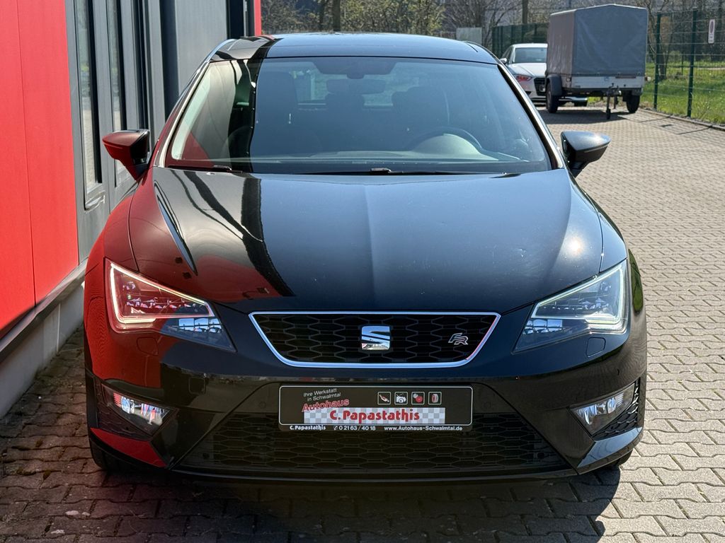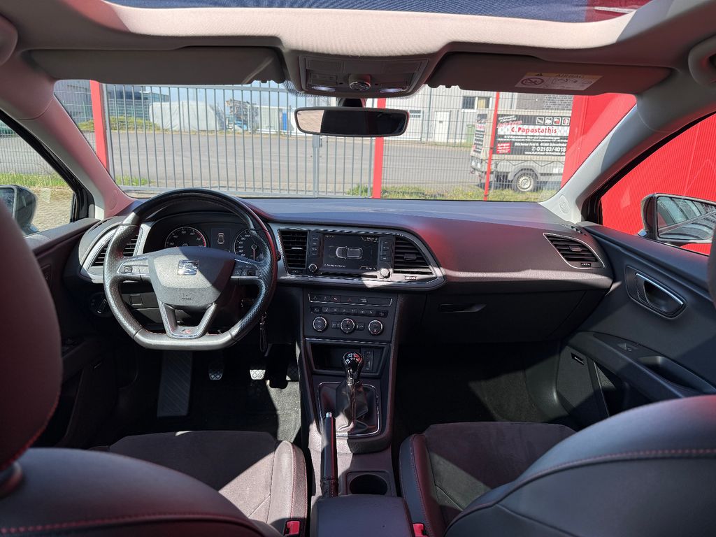 Ablagetasche an Vordersitzlehnen, Airbag Beifahrerseite abschaltbar, Airbag Fahrer-/Beifahrerseite, Antriebs-Schlupfregelung (ASR), Außenspiegel elektr. anklappbar, Außenspiegel elektr. verstell-, heiz- und anklappbar, beide, Außenspiegel mit Spiegelabsenkung, rechts, Außenspiegel und Türgriffe außen in Wagenfarbe, Außentemperaturanzeige, Blinkleuchten LED in Außenspiegel integriert, Bordcomputer, Bremsassistent, Elektron. Differentialsperre (EDS), Fahrassistenz-System: Berganfahr-Assistent (Hill-Holder), Fahrassistenz-System: Berganfahr-Assistent und Elektron. Differentialsperre, Fahrassistenz-System: Fahrprofilauswahl (SEAT Drive Profile), Fahrassistenz-System: Umfeldbeobachtungssystem (Front assist) mit City-Notbremsfunktion, Fensterheber elektrisch hinten, Handschuhfach beleuchtet, Heckleuchten LED, Innenausstattung: Chrom-Applikationen, Isofix-Aufnahmen für Kindersitz, Karosserie: 5-türig, Klimaanlage Climatronic 2-Zonen, Knieairbag Fahrerseite, Kopf-Airbag-System, Kopfstützen hinten (3-fach), Kopfstützen vorn verstellbar, Lendenwirbelstütze Sitz vorn links, verstellbar, Lendenwirbelstütze Sitz vorn rechts, verstellbar, Lenkrad (Sport/Leder), Mittelkonsole vorn mit Mittelarmlehne, Becherhalter, Ablagebox und Luftausströmer hinten, Modellpflege, Motor 1,4 Ltr. - 110 kW 16V TSI ACT, Reifenkontroll-Anzeige, Rücksitzlehne geteilt/klappbar (1/3-2/3), Schadstoffarm nach Abgasnorm Euro 6, Schalt-/Wählhebelgriff Leder, SEAT Media-System Plus, Seitenairbag, Seitenscheiben hinten und Heckscheibe abgedunkelt, Sitz vorn links höhenverstellbar, Sitz vorn rechts höhenverstellbar, Sonnenblende links mit Spiegel (beleuchtet), Sonnenblende rechts mit Spiegel (beleuchtet), Sport-Fahrwerk FR / Cupra, Sportsitze vorn, Start/Stop-Anlage, Stau-/Ablagefach unter Sitze vorn, Steckdose (12V-Anschluß) vorn, Stoßfänger lackiert, Wärmeschutzverglasung