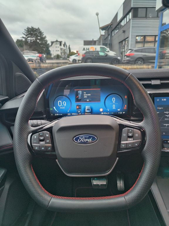 Mild-Hybrid 92 kW (Motor 1,0 Ltr. - 92 kW EcoBoost), Schadstoffarm nach Abgasnorm Euro 6e, Ambiente-Beleuchtung vorn (LED), Antischlupfregelung (ASR), Audio-Navigationssystem, Audiobedienung am Lenkrad, Außenspiegel elektr. anklappbar, verstell- und heizbar, Body-Styling-Paket, Dachhimmel Stoff, dunkel, Dachspoiler (große Ausführung) Wagenfarbe, Eco-Anzeige für verbrauchsoptimiertes Fahren (EcoCoach), Einparkhilfe vorne und hinten, Fahrassistenz-System: Berganfahr-Assistent (Hill-Holder), Falschfahrer-Warnfunktion, Fernlichtassistent (Scheinwerfer mit Abblendautomatik), Notbrems-Assistent, Post-Collision-System, Pre-Collision-System (Kamera-basiert), Spurhalteassistent mit Müdigkeitserkennungs-Sensor, Verkehrsschildassistent, Farbdisplay (12 Zoll), Farbdisplay für Bordcomputer, Fensterheber elektrisch vorn + hinten mit Komfortschließung, Fußmatten Teppich, Getriebe 7-Gang - Doppelkupplungsgetriebe, Heckleuchten LED, Innenspiegel mit Abblendautomatik, Intelligent Protection System (IPS), Intelligenter Geschwindigkeits-Begrenzer, Isofix-Aufnahmen für Kindersitz, Klimaautomatik, Kombiinstrument Digitalanzeige 12,3 Zoll, Komfort-Paket, Kopfstützen hinten mechan. verstellbar (3 Stück), Laderaumboden variabel (Ford Megabox), Lendenwirbelstütze vorn, Lenkrad (Sport/Leder, ST), Lenksäule (Lenkrad) höhen-/längsverstellbar, LM-Felgen, Modellpflege, My Key (2. Fahrzeugschlüssel programmierbar), Nebelscheinwerfer LED, Otto-Partikelfilter (OPF), Pedale Aluminium, Radioempfang digital (DAB), Radstand 2588 mm, Reifen-Reparaturkit, Reifendruck-Kontrollsystem, Rücksitzlehne geteilt/klappbar (60:40), Scheinwerfer LED, Scheinwerfer-Assistent mit Tag-/Nachtsensor, Sitzbezug / Polsterung: Kunstleder, Sitze vorn höhenverstellbar, Sonnenblende links mit Spiegel (beleuchtet), Sonnenblende rechts mit Spiegel (beleuchtet), Sport-Fahrwerk, Sportsitze vorn, Standard Variante, Start/Stop-Anlage, Türgriffe außen Wagenfarbe, Verglasung hinten abgedunkelt (Privacy Glass)