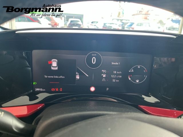 - Weiteres: Scheibenwischer mit Regensensor, Reifen-Reparaturkit, Außenspiegel elektr. verstell- und heizbar, elektr. anklappbar, Elektron. Stabilitäts-Programm Plus (ESP), Heckleuchten LED, LM-Felgen, Schadstoffarm nach Abgasnorm Euro 6d, Scheinwerfer LED, Dachspoiler, Außenspiegel elektr. verstell- und heizbar, elektr. anklappbar, Sitzheizung vorn, Schließ-/Startsystem Keyless Open, Audio-Navigationssystem Multimedia Navi Pro (10 Display), Geschwindigkeits-Regelanlage (Tempomat) mit Abstandsregelung und Stopp-Funktion, Multifunktionsanzeige mit Touchscreen-Farbdisplay 12 Zoll, Seitenairbag vorn, Kopf-Airbag-System, Tagfahrlicht LED, Getriebe Automatik - mit Start-/Stop (8-Stufen), Einschaltautomatik für Fahrlicht mit Tunnelerkennung, Anti-Blockier-System (ABS), Parkpilotsystem vorn und hinten, Rückfahrkamera mit 180° Umgebungsansicht, Antriebsart: Frontantrieb, Autonomer Notbrems-Assistent mit Frontkollisionswarnung und Fußgängererkennung, Bluetooth Audio-Streaming, Bremsassistent, DAB-TuMP3-Schnittstelle für Mobiltelefon/Handy, Müdigkeitserkennungs-Sensor, Nebelscheinwerfer LED, Opel Connect, Polster: Stoff / Ledernachbildung, Sicht-Paket, Smartphone Schnittstelle, Spurhalteassistent, Start/Stop-Anlage, Technologie-Paket Park & Go, Totwinkel-Assistent, Verkehrszeichenerkennung, Wärmeschutzverglasung, Wärmeschutzverglasung hinten abgedunkelt (Solar-Protect)