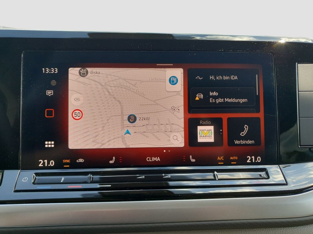 digitaler Radioempfang; Mobiltelefon-Schnittstelle; Navigationssystem "Discover Pro" mit 25,4 cm (10") Touch-Farbdisplay inklusive "Streaming & Internet"; 2 USB-C-Schnittstellen vorn, 4 USB-C-Ladebuchsen im Fahrgastraum; App-Connect inklusive App-Connect Wireless für Apple CarPlay und Android Auto; Sprachassistent IDA und elektronische Sprachverstärkung; Vorbereitet für VW Connect und VW Connect Plus; Optionsinfotainment (MIB3 MP) Ausf.1; 8 Lautsprecher ( passiv )