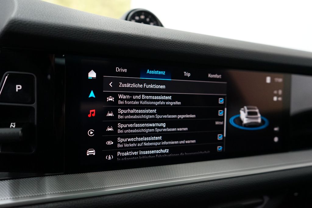 Airbag Beifahrerseite abschaltbar, Airbag Fahrer-/Beifahrerseite, Aktive Motorhaube, Anhängerkupplung Vorbereitung, Antischlupfregelung (ASR), Antriebsart: Allradantrieb, Automatisches Bremsen Differential (ABD), Außenspiegel asphärisch, links, Außenspiegel elektr. anklappbar, Außenspiegel elektr. verstell- und heizbar, Außenspiegel mit Umfeldleuchte LED, Blinkleuchten LED, Bremssättel schwarz eloxiert, Connect Plus (Bluetooth, Apple CarPlay, WLAN, Vehicle-Tracking-System), Dachhimmel Stoff, Dachspoiler, Diebstahl-Warnanlage mit Innenraumüberwachung, Einschaltautomatik für Fahrlicht, Einstiegsblenden (Edelstahl), Elektromotor 130 kW (Hybridantrieb), Endrohrblende Sport-Auspuffanlage, Fahrassistenz-System: Bergabfahr-Assistent (PHC), Fahrassistenz-System: Berganfahr-Assistent (Hill-Holder), Fahrassistenz-System: Multikollisionsbremse (Multi Collision Brake), Fondsitzanlage (2 Sitzplätze), Getränkehalter, Heckklappe mit automatischem Öffnungs- und Schließsystem, Heckleuchten LED, Heckscheibe heizbar, Heckscheibenwischer, Heckspoiler adaptiv ausfahrbar (2-Wege), Hybrid 346 kW (Motor 3,0 Ltr. - 224 kW), Innenausstattung: Teilleder, Innenraumfilter: Aktivkohlefilter (Geruchsfilter), Isofix-Aufnahmen für Kindersitz an Rücksitz, Karosserie: 4-türig, Keyless-Start, Klimaautomatik 2-Zonen, Knieairbag, Kopf-Airbag-System (Curtain-Airbag), Kraftstofftank: 75 Ltr., Ladevorrichtung On-Board-Lader (bis 3,6 kW), Lenksäule (Lenkrad) verstellbar, Leuchtweitenregelung automatisch, Matrix-LED-Scheinwerfer, Mobile Online Dienste Android Auto, Modellpflege, Motor-Schleppmoment-Regulator (MSR), Motorsound-System (Porsche Electric Sport Sound), Multimediabuchse USB-Anschlüsse im Fond, Nichtraucher-Paket, Otto-Partikelfilter (OPF), Panorama-Glasdach (vollverglaste Dachfläche), Parkbremse elektrisch, Porsche Communications Management (PCM) inkl. Online - Navigationsmodul, Porsche Traction Management (PTM), Porsche Universal-Ladegerät (AC), Radstand 2895 mm, Reifen-Reparaturkit, Reifendruck-Kontrollsystem, Rücksitzlehne geteilt/klappbar (40:20:40), Schadstoffarm nach Abgasnorm Euro 6d, Seitenairbag vorn, Servolenkung Plus (geschwindigkeitsabhängig), Sonnenblenden mit Spiegel (beleuchtet), Sport Taste, Sport-Chrono-Paket, Start/Stop-Anlage, Tagfahrlicht 4-Punkt-LED, Uni-Lackierung, Verglasung getönt, Vorrüstung Mobiltelefon/Handy mit Bluetooth-Schnittstelle, Ambiente-Beleuchtung, Head-up-Display, Regensensor