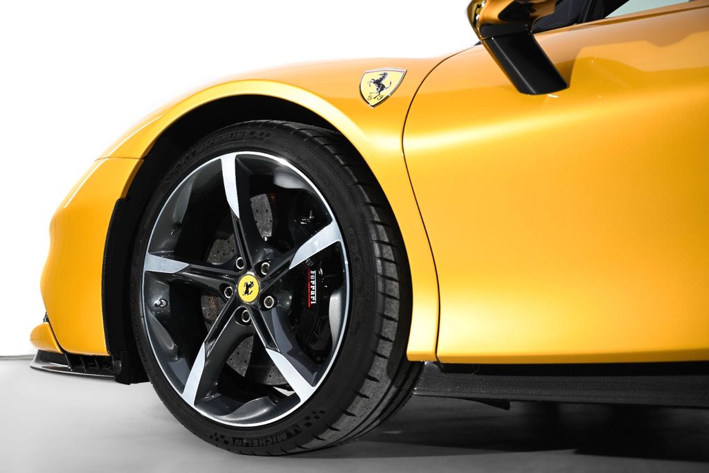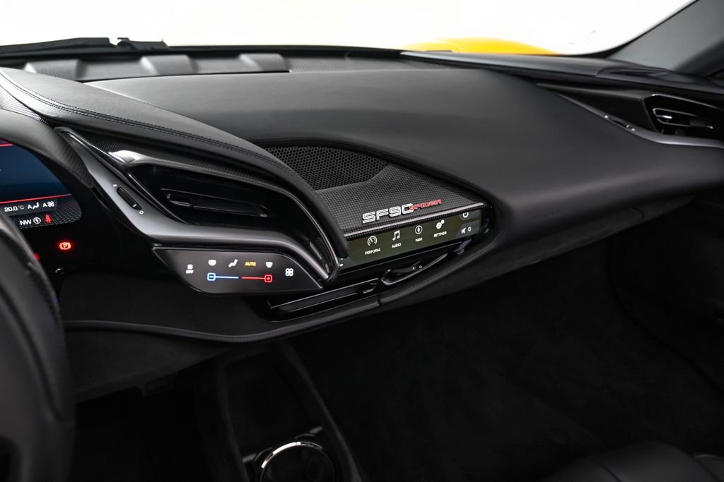 The car is finished in Giallo Montecarlo, a special three-layer paint that was used as the launch color for the SF90 Spider. This is paired with the two-tone bodywork option, featuring the roof and pillars in Nero. This example was also ordered with all available exterior carbon fiber options, including the front spoiler, side air intakes, underdoor covers, and the rear diffuser.