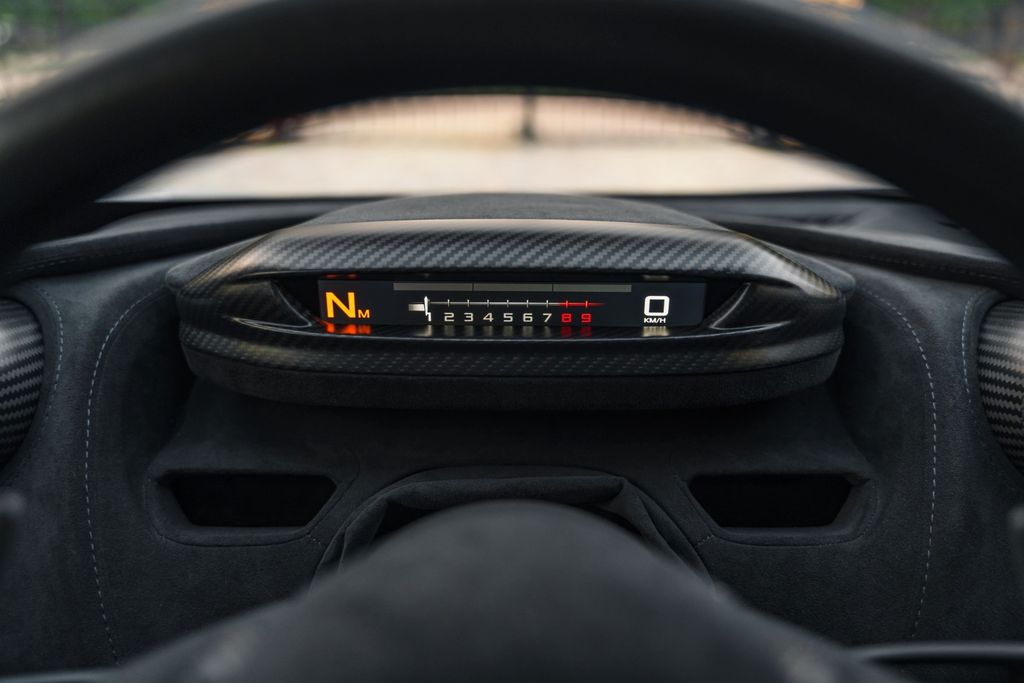 The 765LT Coupe is powered by a 4.0L twin-turbo V8 producing 765 hp and 800 Nm of torque, paired with a 7-speed dual-clutch transmission, for a dry weight of only 1,229 kg and a power-to-weight ratio of approximately 622 hp/ton. Performance is therefore exceptional: 0 to 60 mph in 2.7 seconds, 0 to 125 mph in 7.2 seconds, the standing 400 m in 9.9 seconds, with a top speed of 205 mph, and braking from 60 to 0 mph in 29.5 meters. This efficiency also relies on extensive weight-saving measures, including a titanium exhaust, numerous carbon components, and removed equipment. Its steering is razor-sharp and the turning radius has been significantly improved.
