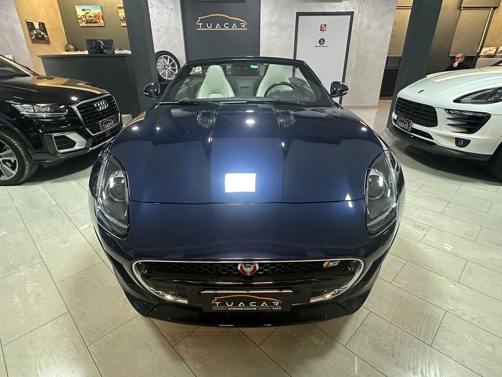 Splendida Jaguar F-Type S Spider, nel raro allestimento blu metallizzato e pelle totale bianca.