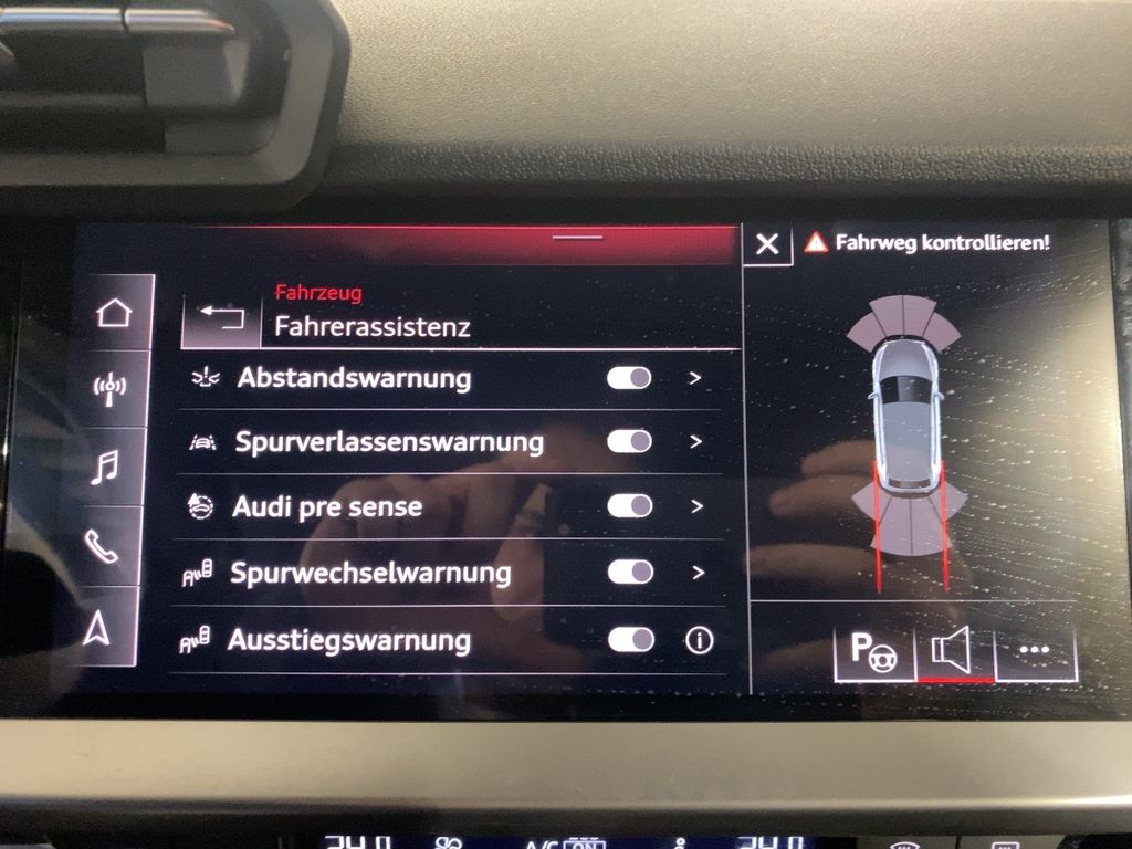 Geschwindigkeitsbegrenzungsanlage; Fernlichtassistent; Spurverlassenswarnung; Ausweichassistent und Abbiegeassistent; Spurwechselwarnung mit Ausstiegswarnung und Querverkehrassistent hinten; Speed-Limiter ohne GRA u.ohne ACC. FOD: ACC möglich; Parkassistent mit Einparkhilfe plus; Licht- / Regensensor; Audi pre sense front; Audi connect Notruf & Service mit Audi connect Remote & Control; gesetzlicher Notruf; Mit Multifunktionskamera