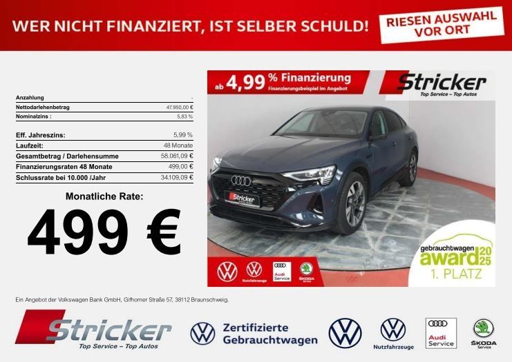 1. Hand; Scheckheftgepflegt; Matrix LED-Scheinwerfer mit dynamischer Lichtinszenierung und dynamischem Blinklicht; Sitzheizung vorn; Umgebungskameras; Kamerabasierte Verkehrszeichenerkennung; MMI Navigation plus mit MMI touch response; Adaptiver Fahrassistent mit Notfallassistent; Adaptiver Geschwindigkeitsassistent mit Geschwindigkeitsbegrenzer, Effizienz-, Ausweich- und Abbiegeassistent; Spurwechselwarnung mit Ausstiegswarnung und Querverkehrsassistent hinten; Parkassistent mit Einparkhilfe plus; Parkassistent plus; Komfortschlüssel inkl. sensorgesteuerter Gepäckraumentriegelung; Regensensor; Audi Soundsystem; Audi pre sense front; 4-Wege-Lendenwirbelstütze für die Vordersitze; Außenspiegel elektrisch einstell-, beheiz- und anklappbar, automatisch abblendend mit Memory-Funktion; Kreuzungsassistent; Touch Screen; Smartphone-Interface; nicht förderfähig im Rahmen der BAFA ! THG Quote für 2026 und 2027 bereits ausgeschöpft!; Reichweite 557 km nach WLTP; Assistenzpaket plus mit Parkassistent plus; Kapazität: 106 kWh; Details zur Finanzierung unten im Inserat! Sie möchten eine Anzahlung leisten, Ihr altes Fahrzeug eintauschen oder haben eine abweichende jährliche Fahrleistung? Alles kein Problem, wir machen Ihnen gerne ein Angebot!