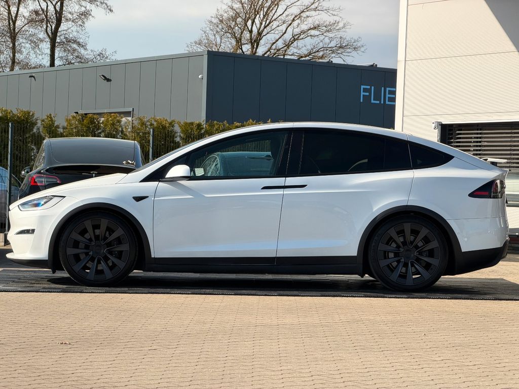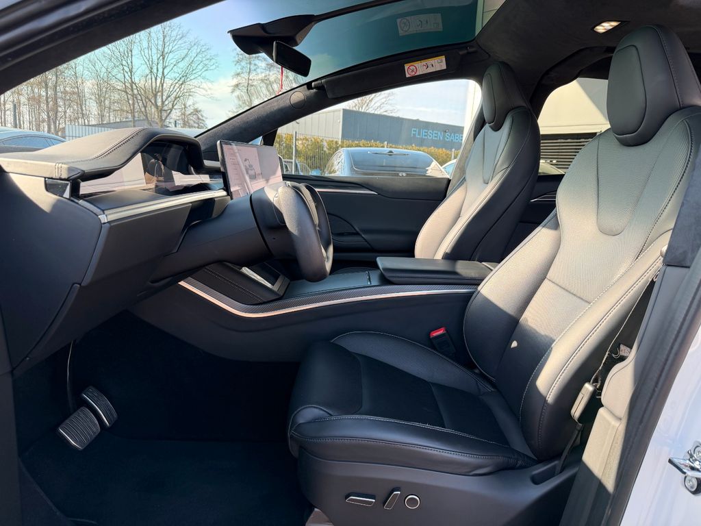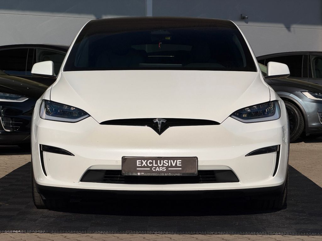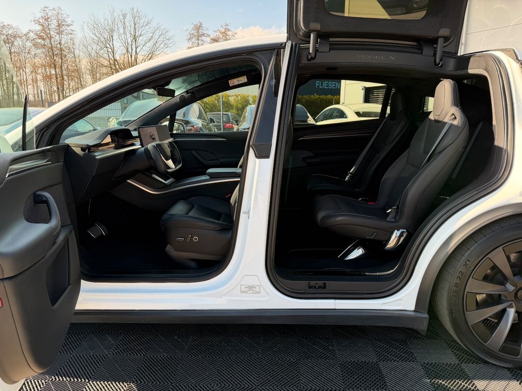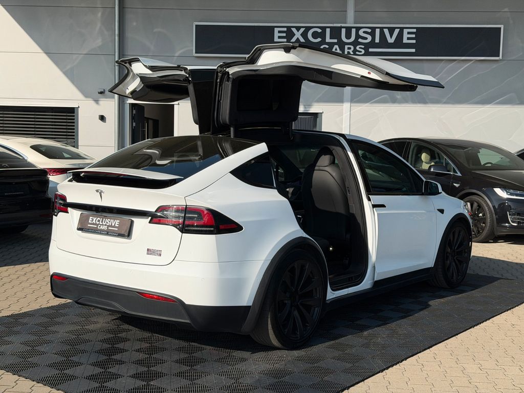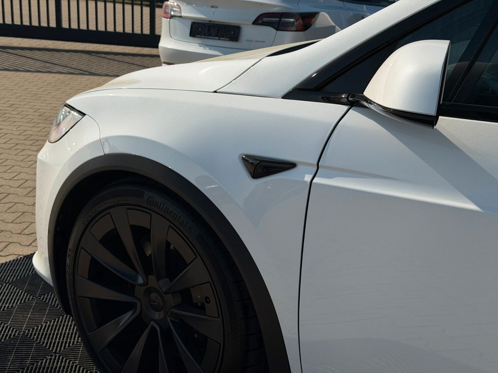 Wir freuen uns, Ihnen dieses beeindruckende Tesla Model X Plaid Tri Motor 6 Sitzer auf 22" Turbine in der eleganten Farbe Pearl White Multicoat präsentieren zu dürfen – ausgestattet mit edlen Black PUR Premium-Sitzen im Colorway-Design und stilvollem Carbon-Fibre-Dekor.