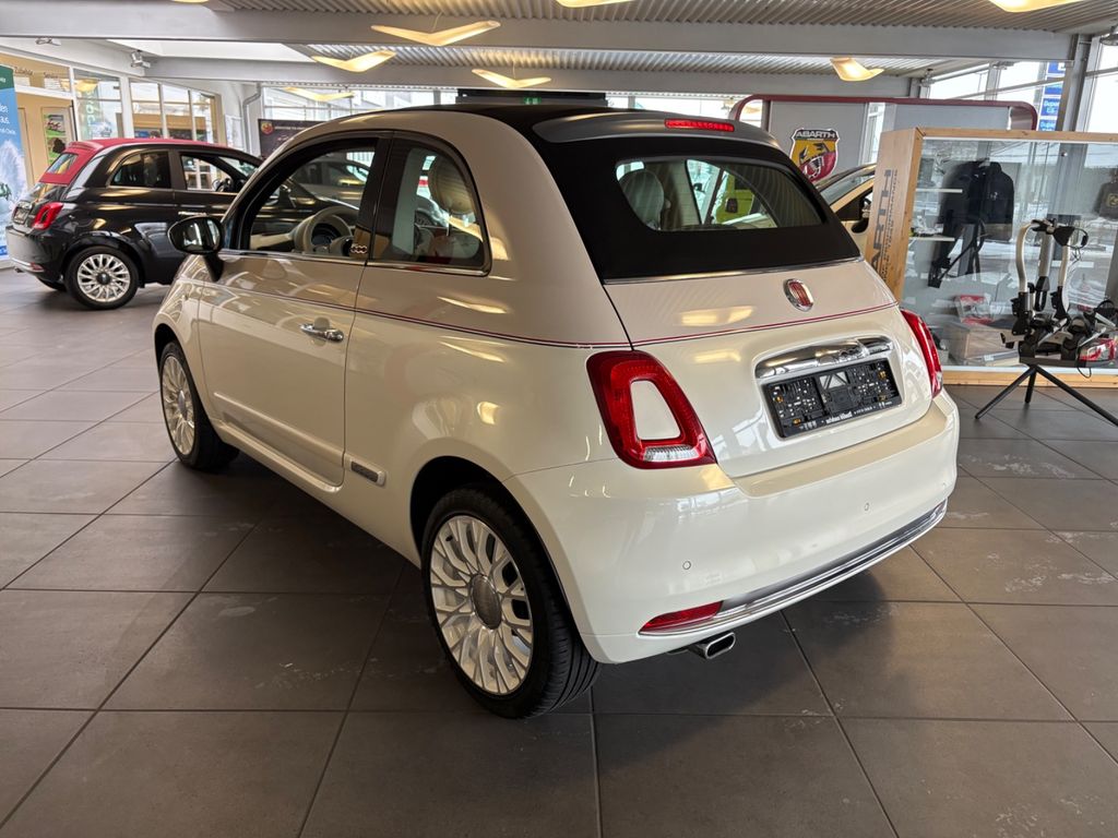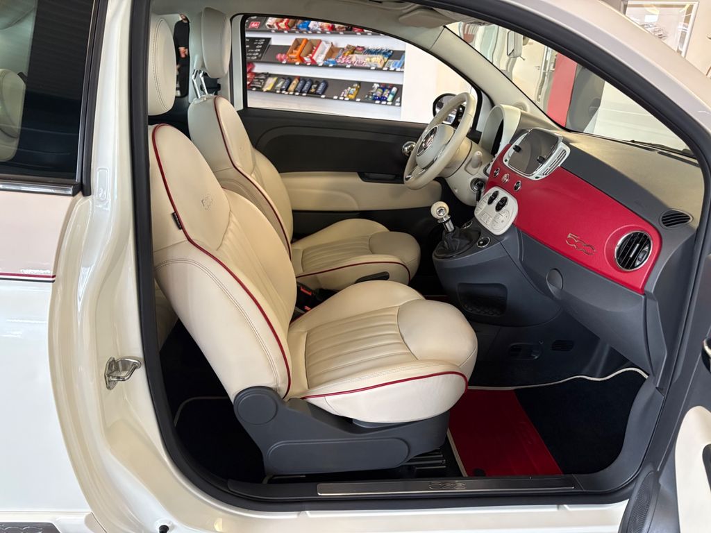 Im Innenraum mischt Fiat moderne Elemente mit Retro-Details. Als Kombiinstrument fungiert ein modernes Farbdisplay. Zusätzlich befindet sich in der Armaturenbrettmitte ein großer Touchscreen für das optionale Navi-Infotainmentsystem. Das große Schmuckpaneel im Armaturenbrett ist mit rotem Vinyl bezogen. Im Kontrast dazu sind viele Elemente elfenbeinfarben, wie etwa das Lederlenkrad, der Lederschaltknauf, die Ledersitze oder die Schaltkulisse der Klimaautomatik. Spezielle Alueinstiegsleisten, Fußmatten und eine kleine Aluplakette mit Nummerierung in der Mittelkonsole runden den Sondertrimm ab.