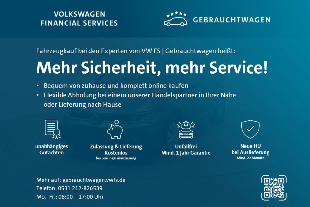 Sobald Sie uns über die Kontaktinformationen per E-Mail oder Telefon Ihr Interesse signalisieren, wird sich unser Team umgehend bei Ihnen melden. Sie erhalten von uns den direkten Link für das Fahrzeuginserat bei Volkswagen Financial Services, um alle weiteren Informationen zum Fahrzeug und Angebot zu erhalten