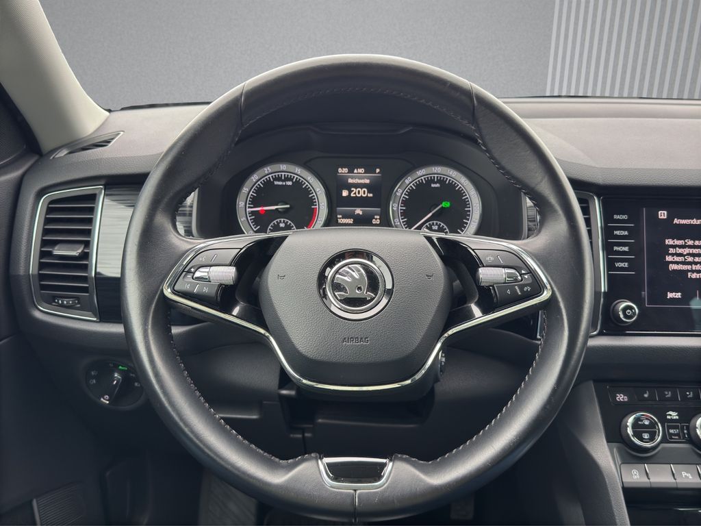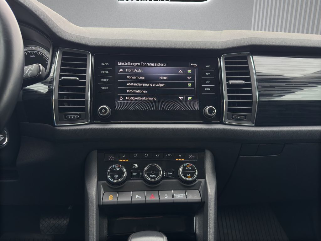 Sonderausstattung:7-Gang-Automatikgetriebe für Allrad, Ambiente-Beleuchtung LED, Anhängevorrichtung mechanisch schwenkbar und elektrisch auslösbar, Ausstattungs-Paket: Family, Business-Paket Amundsen, Einparkhilfe vorn und hinten, mit Rückfahrkamerasystem, Elektrische Luftzusatzheizung, Front Assist inkl. City ANB, Geschwindigkeitsregelanlage plus Speed-Limiter, Isofix-Aufnahmen für Kindersitz an Beifahrersitz, LED- Hauptscheinwerfer mit Kurvenfahrlicht (spez. gestrakter Tagfahrlichtsignatur), Leichtmetallräder 7J x 18, Metallic-Lackierung, Navigationssystem Amundsen + Web radio, Rückfahrkamera, Sitzeinstellung,elektrisch für beide Vordersitze mit Memory, Sitzheizung vorn + hinten, "SMART LINK" (drathlos für Apple), "SUNSET", Kodiaq Trittbretter seitlich, Zentralverriegelung "Keyless-Entry"