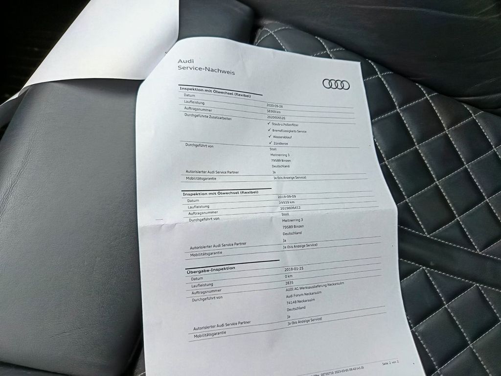 Sonderausstattung: bevorzugt an Händler oder ExportAblage- und Gepäckraum-Paket, Akustikglas Türscheiben vorn, Ambiente-Beleuchtung, Assistenz-Paket Stadt mit Assistenz-Paket Parken, Assistenz-Paket Tour, Audi connect (Internetbasierende Dienste), Audi connect (Notruf- und Assistance-System), Ausstattungs-Paket: Technology Selection, Außenspiegel elektr. verstell-, heiz- und anklappbar, mit Abblendautomatik und Memory, Bluetooth-Freisprecheinrichtung mit Spracherkennung (Audi Phone Box), Bremssättel Rot lackiert, Diebstahlsicherung für Räder (Felgenschlösser), Doppel-Sonnenblenden (verschiebbar, ausziehbar), Fahrassistenz-System: Anfahr-Assistent (hold assist), Fahrwerk mit Dämpferregelung (Magnetic Ride), Head-up-Display, Innenausstattung: Dekoreinlagen Carbon Atlas, Innenausstattung: Interieurelemente in Kunstleder, Innenspiegel mit Abblendautomatik, Isofix-Aufnahmen für Kindersitz an Beifahrersitz, Komfort-Klimaautomatik 3-Zonen, Lendenwirbelstützen vorn, pneumatisch verstellbar, mit Massagefunktion, Lenkrad (Sport/Leder - 3-Speichen, unten abgeflacht) mit Multifunktion plus, LM-Felgen 8,5x19 (5-Speichen, V-Design, kontrastgrau, teilpoliert), Matrix-LED-Scheinwerfer, Metallic-Lackierung, Panoramadach vorn elektrisch, hinten fest, Radioempfang digital (DAB), S Sportsitze vorn, Seitenairbag hinten, Sender für Garagentoröffner (integriert), Sitzbezug / Polsterung: Leder Feinnappa mit Logo-Prägung in Vordersitzlehnen, Sitze vorn elektr. verstellbar (links mit Memory), Sonnenschutzrollo an Türscheiben hinten, Sound-System Bang & Olufsen, Sportdifferential, Standheizung, Wagenheber, Wärmeschutzverglasung mit Frontscheibenheizung (Dämmglas)
