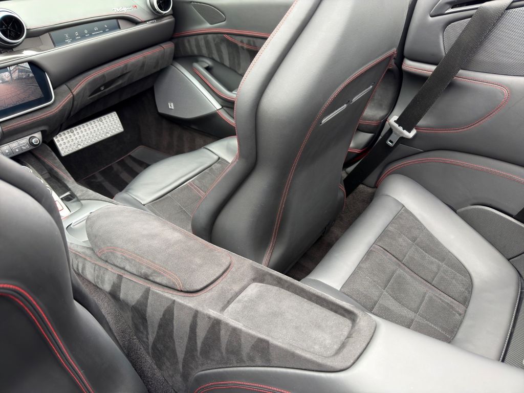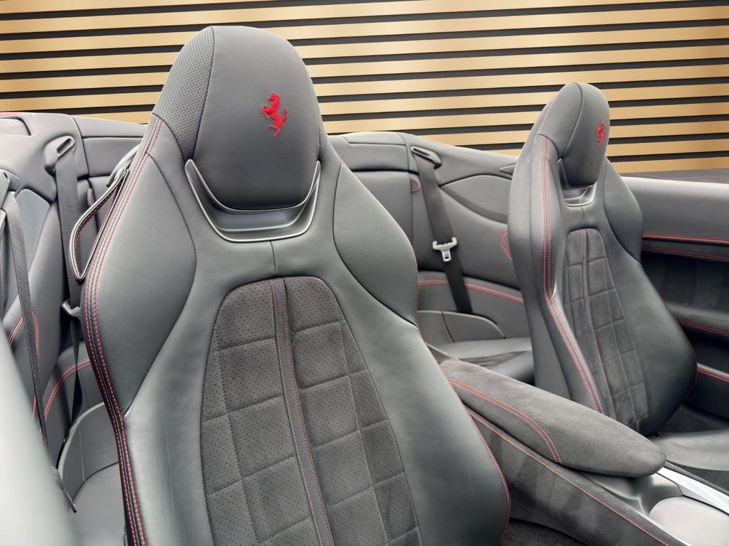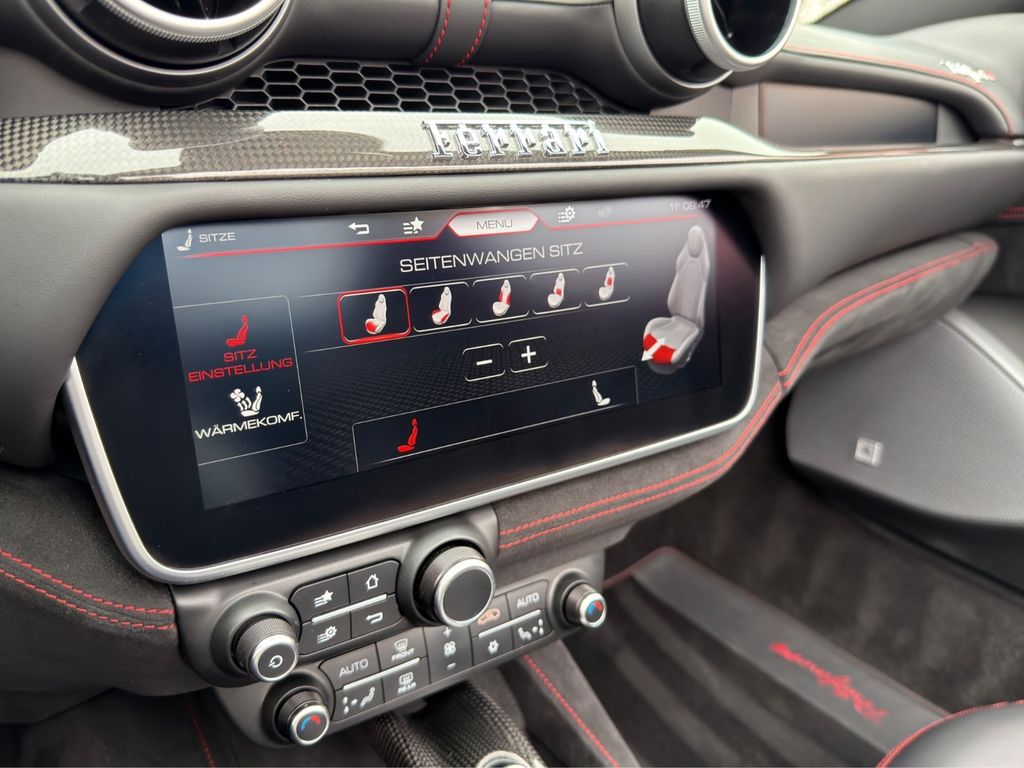 Der Innenraum überzeugt durch eine besonders edle Materialkomposition: Alcantara in Nero, kombiniert mit hochwertigen Carbonfaser-Applikationen, verleiht dem Interieur eine zugleich sportliche wie luxuriöse Anmutung. Feine Kontrastnähte in Rosso sowie das auf den Kopfstützen gestickte Cavallino unterstreichen den exklusiven Charakter dieses Fahrzeugs.