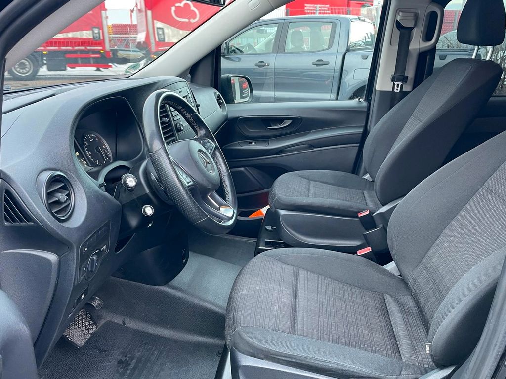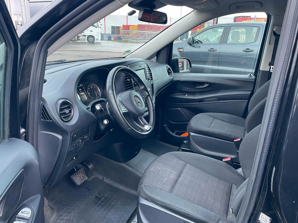 3. Bremsleuchte, Adaptives Bremslicht, Airbag Beifahrerseite, Airbag Fahrerseite, Anfahrhilfe (Berganfahr-Assistent), Anzeige für Waschwasserstand, Außenspiegel asphärisch, beide, Außenspiegel elektr. verstell- und heizbar, beide, Außentemperaturanzeige, Befestigungsschienen für Dachträger, BlueEfficiency-Paket, Bodenbelag: Fahrgastraum TPO, Bremssystem mit ABS+ASR, Dachverkleidung, Design- und Ausstattungslinie PRO, Einschaltautomatik für Fahrlicht, Einstiegsgriff hinten, Fahrassistenz-System: Anfahr-Assistent (Berganfahr-Assistent), Fahrassistenz-System: Attention-Assist (Müdigkeitserkennungs-Sensor), Fahrassistenz-System: Pannenmanagement, Fahrassistenz-System: Seitenwind-Assistent, Fenster für hintere Türen / Heckklappe mit Wisch-/Waschanlage, Fenster im Lade-/FG-Raum: - feststehend, hinten, Fenster im Lade-/FG-Raum: - feststehend, vorn links, Fenster im Lade-/FG-Raum: - feststehend, vorn rechts, Frontscheibe mit Scheibenantenne, Generator 150 A, Getriebe Automatik GTronic - (9-Stufen), Getränkehalter vorn, Gurtstraffer, Haltegriffe im Fond, Handschuhfach abschließbar, Harnstofftank (AdBlue): 24 Ltr., Heckklappe mit Verglasung, Heckscheibe heizbar, Heckscheibenwischer, Innenverkleidung gehobene Ausführung, Karosserie/Aufbau: Kombi Standard, Karosserie/Aufbau: lang, Kindersicherung, Kommunikationsmodul (LTE) für digitale Dienste, Kopf-Airbag-System (Windowbag), Kopf-Schulter-Airbag (Thoraxbag) Fahrer-/Beifahrerseite, Lenkrad (Lenksäule mech. verstellbar), Mercedes-Benz Notrufsystem, Modellpflege, Motor 2,0 Ltr. - 120 kW CDI KAT, Nebelschlussleuchte, PKW-Zulassung, Pro, PTC Heater, Radstand 3200 mm, Reifen 205/65 R16C 103/101 T, Reifendruck-Kontrollsystem, Rückspiegel innen, Schadstoffarm nach Abgasnorm Euro 6d-TEMP, Scheibenwischer mit Regensensor, Schiebetür Lade-/Fahrgastraum rechts mit Verglasung, SCR-System (AdBlue-Technologie), Sicherheitsgurt-System mit Warnanlage (Fahrer-/Beifahrerseite), Sitzbezug / Polsterung: Stoff Caluma, Sitze im Fahrerhaus: Beifahrersitz verstellbar, Sitze im Fahrerhaus: Fahrersitz verstellbar, Sitze im Lade-/FG-Raum: 1.Reihe, 3er-Sitzbank, Klappsitz außen, Sitze im Lade-/FG-Raum: 2.Reihe, 3er-Sitzbank, Stahlfelgen 6,5x16, Vlies-Batterie 92 Ah, Warmluftkanal zum Lade-/Fahrgastraum, Wartungsintervall-Anzeige Assyst, Wärmeschutzverglasung