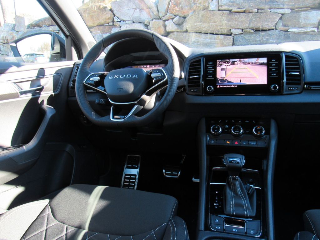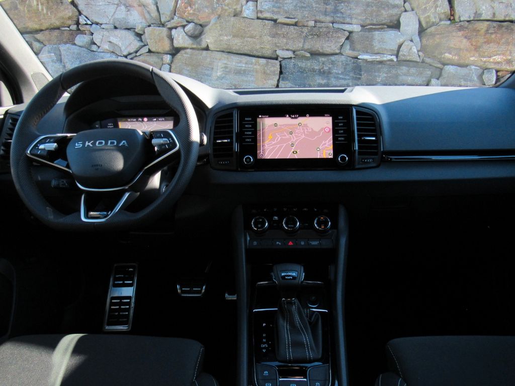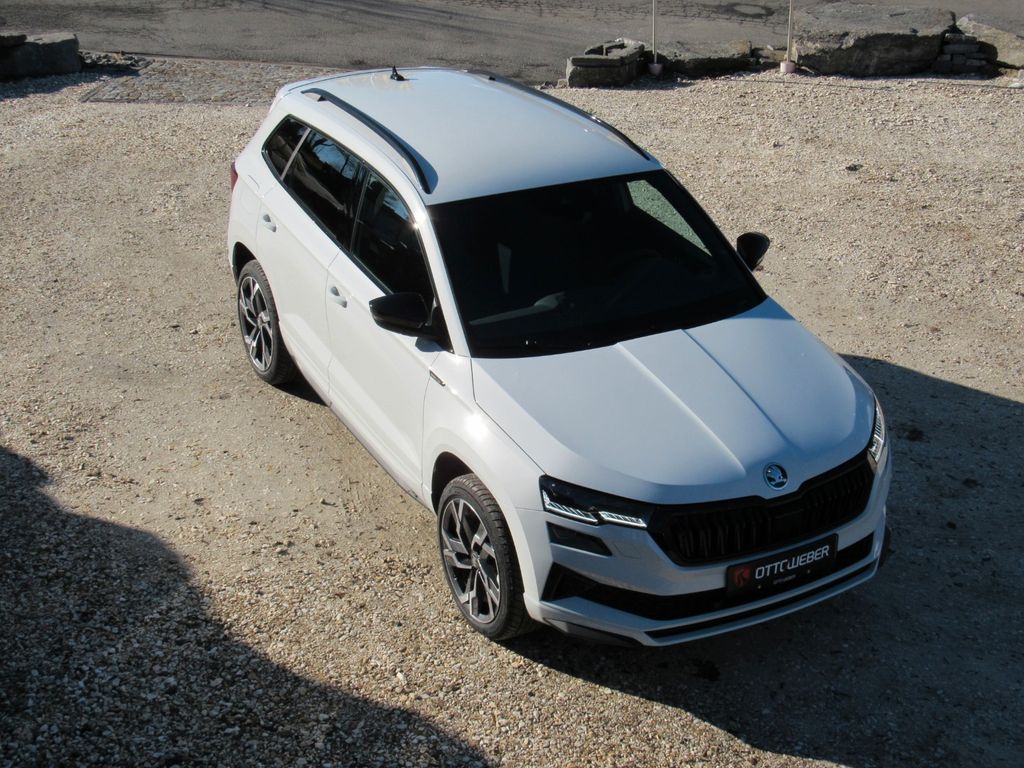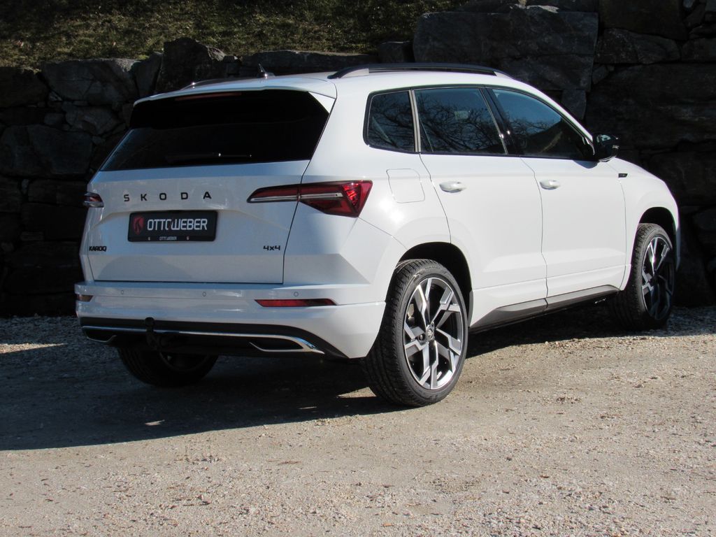 Ablagen; Airbag, Fahrer und Beifahrer (abschaltbar), Fahrer-Knieairbag, Kopfairbags, Seitenairbags vorne; Allergenfilter; Allrad Permanent; Antiblockiersystem (ABS); Antriebsschlupfregelung (ASR); Müdigkeitserkennung; Außenspiegel elektrisch anklappbar inkl. Innen- & Fahrerspiegel mit automatischer Abblendung; Außenspiegel elektrisch einstell- und beheizbar mit integrierten Seitenblinkern; Außenspiegel in Schwarz, Türgriffe in Wagenfarbe lackiert; Beleuchteter Kofferraum; Berganfahr- und Abfahr-Assistent; Bremsassistent, hydraulisch (HBA); Dachreling, schwarz; Dritter Fahrzeugschlüssel; Easy Start (Start-Stopp-Taste); eCall (automatische Notruffunktion bei einem Unfall mit Airbagauslösung); Elektronische Parkbremse inklusive Auto-Hold-Funktion; Elektronische Querdifferenzialsperre (XDS+); ESC Elektronische Stabilisierungskontrolle; Fahrlichtassistent und Regensensor(Tunnellicht, Coming und Leaving-Home-Funktion; Fensterheber elektrisch vorn und hinten inkl. Einklemmschutz und Kindersicherung; Frontradarassistent inklusive City-Notbremsfunktion mit Personenerkennung; Geschwindigkeitsregelanlage (Tempomat) inkl. Speedlimiter; Getriebe: 7-Gang-Doppelkupplungsgetriebe (DSG); Green tec (Start/Stopp-Automatik sowie Bremsenergie-Rückgewinnung); Handschuhfach beleuchtet; Heckscheibe beheizbar; Heckscheibenwischer Aero inkl. Scheibenwaschanlage; Innenspiegelabblendung, automatisch; Interieur Design Sportline(Sitzbezüge in Stoff schwarz, Armaturentafel und Türverkleidung schwarz, Dekorleisten "Schwarz", Tür-Dekor "Carbon-Optik", Dachhimmel in Schwarz); ISOFIX-Vorbereitung auf den äußeren Rücksitzen inkl. Top-Tether; Kessy (schlüsselloses Zugangs- und Start-Stopp-System); Klimaanlage Climatronic 2-Zonen (vollautomatisch, für Fahrer und Beifahrer getrennt regelbar); Kofferraumabdeckung, fest; Kopfstützen vorne fest integriert, hinten höheneinstellbar; Lackierung: Sonderlackierung; LED-Bremsleuchte im Heckspoiler; LED-Heckleuchten in Kristallglasoptik und animierten Blinkern; Lenkrad: Beheizbares Sport-Lederlenkradmit Multifunktionstasten inkl. Schaltwippen; Leseleuchten vorn am Dachhimmel; Mittelarmlehne hinten mit Becherhaltern und Durchlademöglichkeit; Mittelarmlehne vorn, inkl. Ablagefach; Motorschleppmomentregelung (MSR); Multikollisionsbremse; Nebelscheinwerfer; Ottopartikelfilter; Paket: Infotainment Basic (Musiksystem (Bolero) und 8" Farbdisplay, Wireless SmartLink, Sprachbedienung, Phonebox mit induktiver Ladefunktion, Digital Cockpit Plus); Paket: Licht & Sicht (Matrix LED-Hauptscheinwerfer, LED-Ambientebeleuchtung sowie Fußraumbeleuchtung, Boarding Spot Logo-Projektor an den Vordertüren, Dynamischer Fernlichtassistent - Dynamic Light Assist); Paket: Sport 4x4 (Fahrprofilauswahl, Progressivlenkung, Pedalerie in Edelstahloptik, Offroad-Assistent); Paket: Winter (Beheizbare Vordersitze, Scheinwerferreinigungsanlage, Beheizbares Lederlenkrad mit Multifunktionstasten inkl. Schaltwippen); Parksensoren hinten; Radiozubehör: Digitaler Radioempfang DAB+; Radiozubehör: USB-Anschluss in der Mittelkonsole (Type-C); Reifen-Mobilitätsset (Reifenpannenspray inkl. Kompressor); Reifendrucküberwachung; elektromechanisch; Sicherheitsgurte Karoq (Höheneinstellbare Dreipunkt-Sicherheitsgurte vorn, mit Gurtstraffern, Sitze: Höheneinstellbare Vordersitze; Sitze: Lehnenfernentriegelung der Rücksitzlehnen (2. Sitzreihe) im Kofferraum; Skoda Care Connect; Sonnenblende auf Fahrer- und Beifahrerseite mit Make-up-Spiegel (beleuchtet); Spurhalteassistent (Lane Assist);