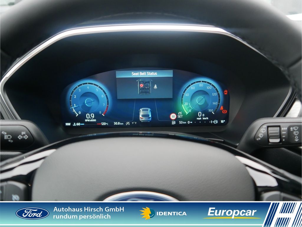 - Weiteres: Geschwindigkeits-Regelanlage (Tempomat), Rußpartikelfilter, Antriebsart: Frontantrieb, Heckleuchten LED, BORDCOMPUTER, Reifen-Reparaturkit, Getriebe 6-Gang - Typ: B6, Rückfahrkamera, Reifendruck-Kontrollsystem, Sonnenblende rechts mit Spiegel (beleuchtet), Nebelscheinwerfer LED, Zentralverriegelung mit Fernbedienung, Dachreling silber, Scheibenwischer mit Regensensor, Schadstoffarm nach Abgasnorm Euro 6d, Induktionsladeschale für mobile Endgeräte, Sportsitze, LM-Felgen, Außenspiegel elektr. anklappbar, Scheinwerfer-Assistent mit Tag-/Nachtsensor, Doppelendrohr Auspuffanlage, Adaptive Scheinwerfer LED mit Abbiegelicht, Motor 1,5 Ltr. - 110 kW EcoBoost KAT (1497 ccm), Anti-Blockier-System (ABS), Antischlupfregelung (ASR), Gepäckraumabdeckung / Rollo, Rücksitzlehne geteilt, Parkpilotsystem vorn und hinten, Lackierung Blazer-Blau, Kombiinstrument Digitalanzeige 12,3 Zoll, Außenspiegel elektr. verstell- und heizbar, Ambiente-Beleuchtung vorn (LED), Auffahrwarnsystem, Berg-Anfahr-Assistent (Hill-Holder), Bremsassistent, Brillenfach in Dachhimmel, Chromeinfassung Seitenscheiben, Dachspoiler in Wagenfarbe, Elektron. Stabilitäts-Programm, Fensterheber elektrisch vorn und hinten mit Komfortschließung, FordPass Connect inkl. eCall, Gurtwarner hinten, Innenspiegel mit Abblendautomatik, Isofix-Aufnahmen für Kindersitz, Klimaautomatik 2-Zonen, Lederlenkrad - 3 Speichen, Lendenwirbelstütze, Lendenwirbelstütze vorn links, Lenksäule höhen-/längsverstellbar, My Key - Zweitschlüssel programmierbar, Post-Collision-System, Pre-Collision-System, Radioempfang Digital (DAB), Rücksitzlehne klappbar, Schalt-/Wählhebelgriff Leder, Scheinwerfer mit Ausschaltverzögerung, Servolenkung elektrisch, Sitzheizung vorn, Spurhalteassistent, Start/Stop-Anlage, Verglasung hinten abgedunkelt (Privacy Glass), Winter-Paket.