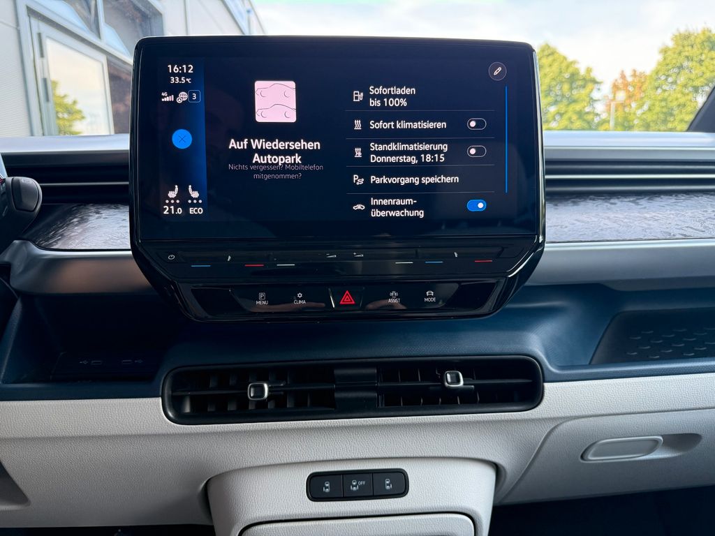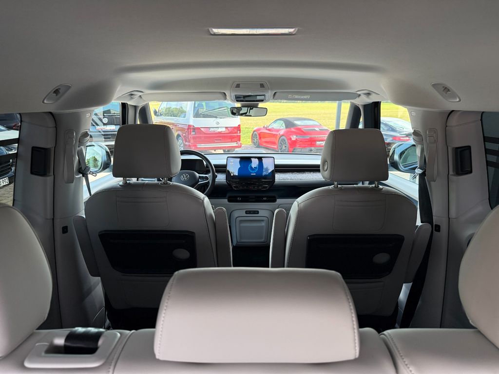 Airbag Fahrer-/Beifahrerseite, Beifahrerairbag abschaltbar, Akustischer Fußgängerschutz, Außensound (e-sound), Antennen-Diversity, Außenspiegel elektr. verstell-, heiz- und anklappbar mit Spiegelabsenkung, Außenspiegel konvex, links und rechts, Außenspiegel schwarz lackiert und Türgriffe außen in Wagenfarbe, Bodenbelag: Teppich verstärkt, Bordwerkzeug, DC / DC Wandler 3 kW, Diebstahlsicherung für Räder (Felgenschlösser), Elektromotor 150 kW (cont. 70 kW), Fahrassistenz-System: Ausweich-Assistent und Abbiege-Assistent, Fahrassistenz-System: Müdigkeitserkennungs-Sensor, Fahrassistenz-System: Notbrems-Assistent (Front Assist) inkl. Fußgänger- und Fahrraderkennung, Fahrassistenz-System: Spurhalteassistent (Lane Assist), Fahrassistenz-System: Verkehrszeichenerkennung, Funkschlüssel (2), Fußraumbeleuchtung vorn und hinten, Gepäckraumabdeckung / Rollo, Getriebe für Elektrofahrzeug, Heckklappe mit Verglasung, Heckscheibe, Heckscheibenwischer mit Intervallschaltung, HV-Batterie 82 kWh brutto / 77 kWh netto, Innenleuchten im Lade-/FG-Raum: LED (Gepäckraum), Innenraumfilter: Aktiv Kombifilter, Insassen-Schutzsystem proaktiv, Intelligent Speed Assist inkl. Geschwindigkeitsbegrenzer, Isofix-Aufnahmen für Kindersitz an Rücksitz, Karosserie/Aufbau: Bus, Klimaautomatik Climatronic (2-Zonen, Standklimatisierung), Kopf-Airbag-System hinten, Ladekabel mit Typ 2-Stecker (16 A, Mode 3), Lautsprecher (9), Mobile Online Dienste App-Connect inkl. App-Connect Wireless (Apple CarPlay, Android Auto), Multifunktionskamera / Frontkamera, Nichtraucher-Paket, Notrufsystem, Radioempfang digital (DAB+), Radstand 2989 mm, Radstand kurz, Reifenkontroll-Anzeige, Schnellladevorrichtung (CCS-Ladedose), Schriftzug / Plakette D-Säule, Seitenairbag, Kopfairbag und Center-Airbag vorn, Service-System: Intelligente Fahrzeugvernetzung (Car2X), Servolenkung elektro-mechanisch, geschwindigkeitsabhängig, Sicherheitsgurte vorn mit Gurtstraffer und Endbeschlagstraffer, höhenverstellbar, Sitze im Fahrerhaus: Beifahrereinzelsitz, Sitze im Fahrerhaus: Fahrer- und Beifahrersitz höhenverstellbar, Sitze im Lade-/FG-Raum: 1.Reihe, 3er-Sitzbank, geteilt/klappbar, Sonnenblenden mit Spiegel (beleuchtet), Stoßfänger in Wagenfarbe, Umfeldbeleuchtung seitlich mit Projektionsfunktion, Verbandkasten und Warndreieck, Verglasung hinten abgedunkelt, Vorbereitung Onlinedienste We Connect (Plus) oder VW Connect (Plus) und Online-Update-Fähigkeit, Warnanlage für Sicherheitsgurte vorn und hinten, Zul. Gesamtgewicht 3,00 t