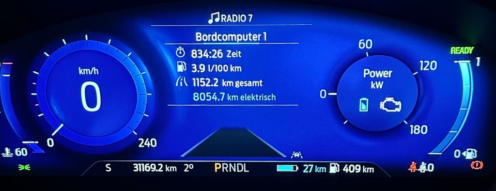 Das Fahrzeug hat aktuell 3,9l kombinierter Verbrauch. Die Verbrauchsanzeige wurde kurz nach der Fahrzeugübergabe zurückgestellt.Betriebsstunden 834:26h / 31152km ges. / 28054 elekt. / 3,9l