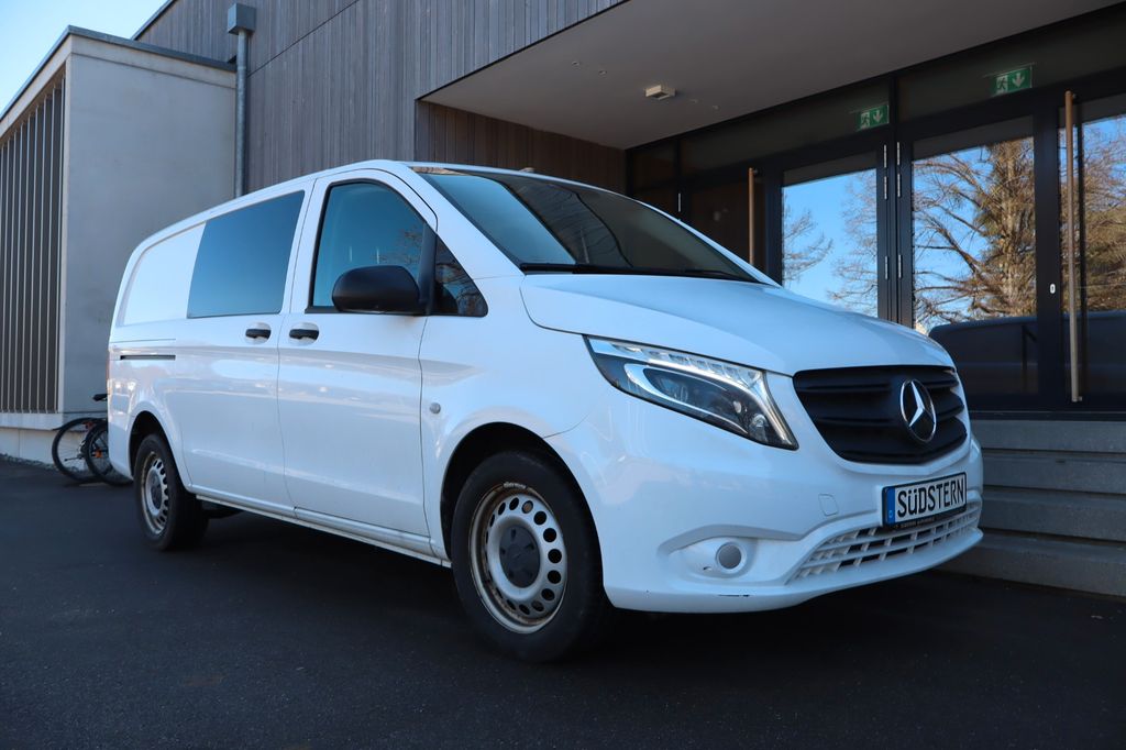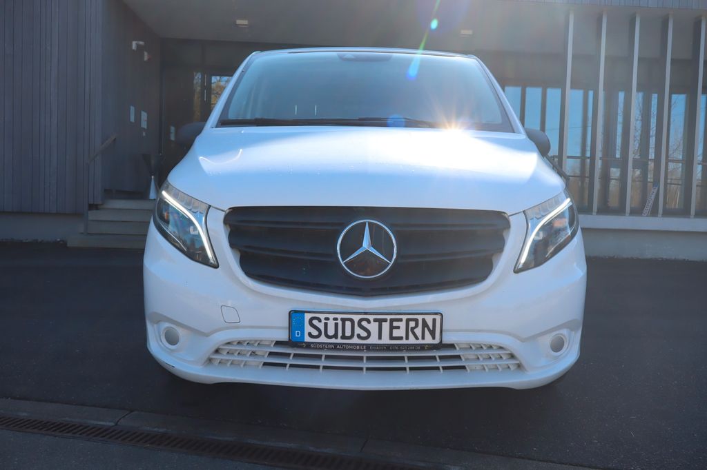 3. Bremsleuchte, Adaptives Bremslicht, Airbag Beifahrerseite, Airbag Fahrerseite, Anfahrhilfe (Berganfahr-Assistent), Außenspiegel asphärisch, beide, Außentemperaturanzeige, Befestigungsschienen für Dachträger, BlueEfficiency-Paket, Bremsassistent, Design- und Ausstattungslinie Base, Fahrassistenz-System: Attention-Assist (Müdigkeitserkennungs-Sensor), Fahrassistenz-System: Pannenmanagement, Fahrassistenz-System: Seitenwind-Assistent, Frontscheibe mit Scheibenantenne, Generator 200 A, Getränkehalter vorn, Gurtstraffer, Handschuhfach abschließbar, Karosserie/Aufbau: Kasten Standard, Karosserie/Aufbau: lang, Kommunikationsmodul (LTE) für digitale Dienste, Lastenverankerung / Verzurrösen, Mercedes-Benz Notrufsystem, Modellpflege, Motor 2,0 Ltr. - 120 kW CDI KAT, Nebelschlussleuchte, Radstand 3200 mm, Reifen 205/65 R16C 103/101 T, Schadstoffarm nach Abgasnorm Euro 6d-TEMP, Schiebetür Lade-/Fahrgastraum rechts, Sicherheitsgurt-System mit Warnanlage (Fahrer-/Beifahrerseite), Sitzbezug / Polsterung: Stoff, Verkleidung Fenstersäulen, Verkleidung im Lade-/FG-Raum: Hartfaser halbhoch, Wartungsintervall-Anzeige Assyst