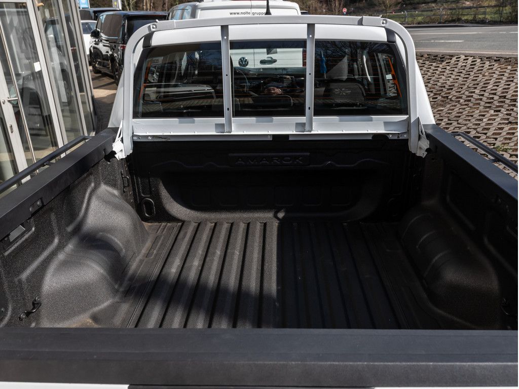Clear White, Fahrersitz mit 6-Wege-Einstellung und Beifahrersitz mit 4-Wege-Einstellung, Kuehlerschutzgitter in Schwarz, Laststuetze mit Schutzrahmen an der Kabinenrueckwand, Anhaengersteckdose, 13-polig, LED-Ladeflaechenbeleuchtung, Stossfaenger vorn in Schwarz, Stossfaenger hinten in Schwarz, 4 Lautsprecher, Infotainment-System mit 25,6 cm (10,1") Touch-Farbdisplay und App-Connect, Vorbereitet fuer Online Dienste, Vorbereitung Online Anti Theft Alarm - Online Diebstahlwarnanlage, Bodenbelag aus Vinyl, Dachhimmel (in Stone Grey), Tuergriffe innen, in Schwarz, Motor 2,0 Ltr. - 125 kW TDI (1996 ccm)