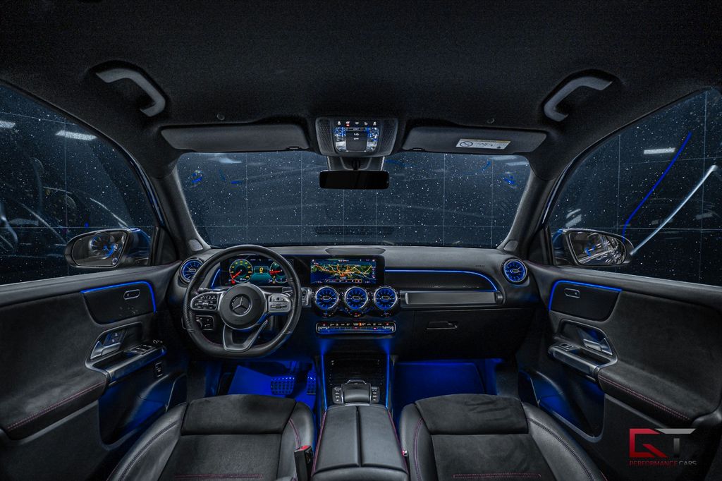 This example is a stylish and stylish family car to say the least, the exterior is dressed very nicely in the paint "Galaxy Blue Metallic" which combines perfectly with the chrome details all around. On the inside you will find comfortable seats upholstered in black microfiber/artificial leather and they are composed of sporty contrast stitching in red. The cabin is exclusively specced with decorative intakes in carbon fiber optics which are also found on the door panels and it is combined with, among other things, the awesome sound system from Mercedes, as well as with the lovely contour lighting which adds a lovely atmosphere.