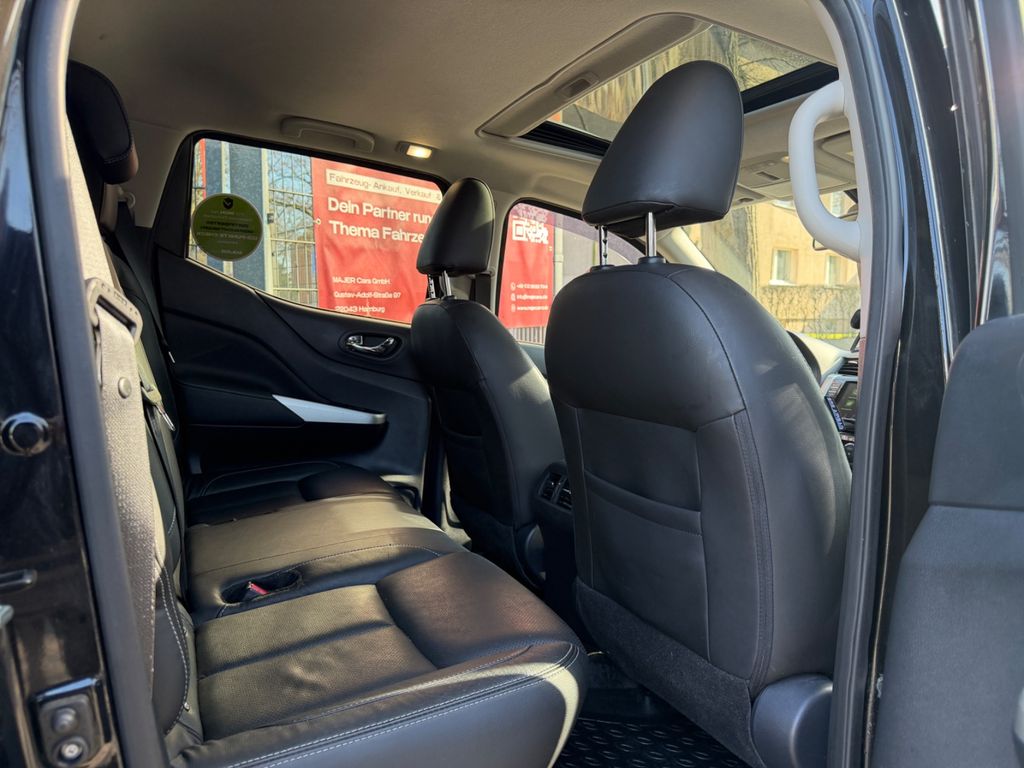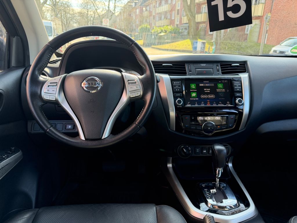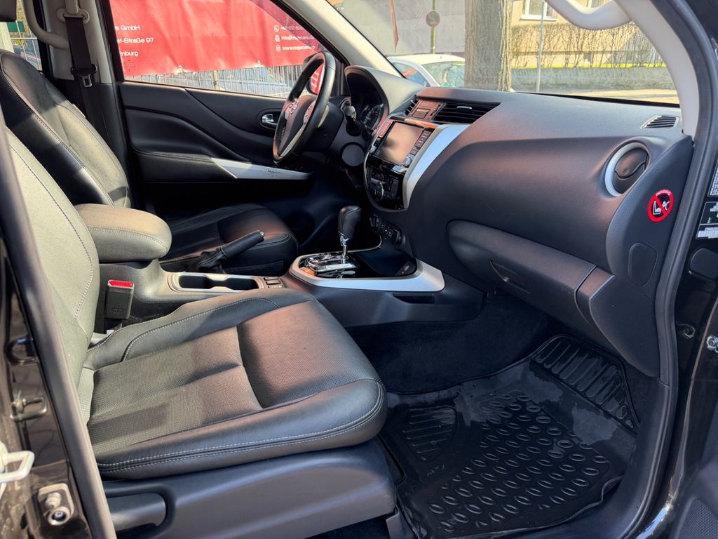 Airbag Beifahrerseite abschaltbar, Airbag Fahrer-/Beifahrerseite, Audiobedienung am Lenkrad, Ausstattungs-Paket: Nissan Connect Navigationssystem mit Around View Monitor, Automatische Fahrlichtschaltung, Außenspiegel elektr. anklappbar, Außenspiegel elektr. verstellbar, Außenspiegel heizbar, Außenspiegel mit Chromblende, Außentemperaturanzeige, Bremsassistent (Nissan Brake-Assist), Chromeinfassung für Nebelscheinwerfer, Coming-Home-Lichtfunktion (Friendly Lightning), Differentialsperre, Differentialsperre mit begrenztem Schlupf, Einparkhilfe hinten, Fahrassistenz-System: Autonomer Notbrems-Assistent, Fahrassistenz-System: Bergabfahr-Assistent, Fahrassistenz-System: Berganfahr-Assistent, Fahrer-Informations-System (FIS) mit Farbdisplay, Fensterheber elektrisch hinten, Frontscheibe mit Bandfilter oben, Geländeuntersetzung, Gurtstraffer, Heckscheibe heizbar, Innenspiegel mit Abblendautomatik, Isofix-Aufnahmen für Kindersitz, Karosserie/Aufbau: Doppelkabine (Double-Cab), Karosserie/Aufbau: Pick-Up, Klimaautomatik 2-Zonen, Knieairbag Fahrerseite, Kopf-Airbag-System, Kopfstützen hinten, Lenksäule (Lenkrad) verstellbar, LM-Felgen, Luftdüsen hinten, Metallic-Lackierung, Motor 2,3 Ltr. - 140 kW dCi Diesel KAT, Optik-Paket, Radioempfang digital (DAB), Radstand 3150 mm, Reserverad in Fahrbereifung, Schadstoffarm nach Abgasnorm Euro 6d-TEMP, Scheibenwischer mit Intervallschaltung, Schienensystem Lastenverankerung, Schmutzfänger hinten, Schmutzfänger vorn, Seitenairbag, Sitz vorn links elektr. verstellbar, Sitz vorn links höhenverstellbar, Sitzbezug / Polsterung: Leder, Sitzheizung vorn, Sprachbediensystem Spracherkennung, Start-Stop-Knopf, Steckdose (12V-Anschluß), Stoßfänger hinten verchromt, Stoßfänger vorn Wagenfarbe, Trittbretter seitlich, Verglasung hinten abgedunkelt, Innenspiegel automatisch abblendend, Sitzheizung vorn