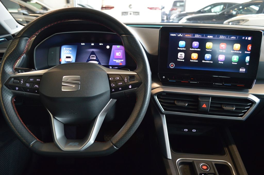 6 Lautsprecher, Ablagetasche an Vordersitzlehnen, Airbag Beifahrerseite abschaltbar, Airbag Fahrer-/Beifahrerseite, Antriebs-Schlupfregelung (ASR), Außenspiegel elektr. verstell-, heiz- und anklappbar mit Spiegelabsenkung, Außenspiegel grau, Blinkleuchten LED in Außenspiegel integriert, Bluetooth-Schnittstelle mit Freisprecheinrichtung integriert, Bordcomputer, Dachreling, Doppeltonhorn, Durchladeeinrichtung (Mittelarmlehne hinten), Einstiegsleisten beleuchtet, Elektron. Querdifferentialsperre (XDS), Fahrassistenz-System: Fahrprofilauswahl (SEAT Drive Profile), Fahrassistenz-System: Müdigkeitserkennung, Fahrassistenz-System: Spurhalteassistent, Fahrassistenz-System: Umfeldbeobachtungssystem (Front assist) mit City-Notbremsfunktion, Fensterheber elektrisch vorn + hinten mit Komfortschaltung, Gepäckraumabdeckung / Rollo, Handschuhfach beleuchtet, Heckleuchten Voll-LED mit dynamischem Lichtband (Infinite Light), Innenraumlicht-Paket LED, Isofix-Aufnahmen für Kindersitz, Karosserie: 5-türig, Klimaanlage Climatronic 3-Zonen, Kofferraumbeleuchtung, Kombiinstrument digital (virtual cockpit), Kopf-Airbag-System, Laderaumboden variabel und herausnehmbar, Lendenwirbelstütze Sitz vorn links, verstellbar, Lendenwirbelstütze Sitz vorn rechts, verstellbar, Lenkrad (Sport/Leder) mit Multifunktion, Mild-Hybrid 110 kW (Motor 1,5 Ltr. - 110 kW eTSI ACT), Mobile Online Dienste Seat Connect, Nebelscheinwerfer LED mit Abbiegelicht, Notrufsystem, Otto-Partikelfilter (OPF), Parkbremse elektrisch mit Auto-Hold-Funktion, Radioempfang digital (DAB+), Reifenkontroll-Anzeige, Rücksitzlehne geteilt/klappbar (1/3-2/3), Rücksitzlehnen umklappbar mit Fernentriegelung im Kofferraum, Schadstoffarm nach Abgasnorm Euro 6d, Schalt-/Wählhebelgriff Leder, Seitenairbag, Seitenairbag vorn mitte (Central Airbag), Seitenscheiben hinten und Heckscheibe abgedunkelt, Sitz vorn links höhenverstellbar, Sitz vorn rechts höhenverstellbar, Sport-Fahrwerk, Sport-Komfortsitze vorn, Start/Stop-Anlage, Steckdose (12V-Anschluß) im Koffer-/Laderaum, Steckdose (12V-Anschluß) vorn, Stoßfänger FR-Design, USB-Schnittstelle vorn (2-fach, Typ C), Verzurrösen Koffer-/Laderaum, Warnanlage für Sicherheitsgurt-System, Wärmeschutzverglasung, Nebelscheinwerfer, Seitenscheiben hinten und Heckscheibe abgedunkelt