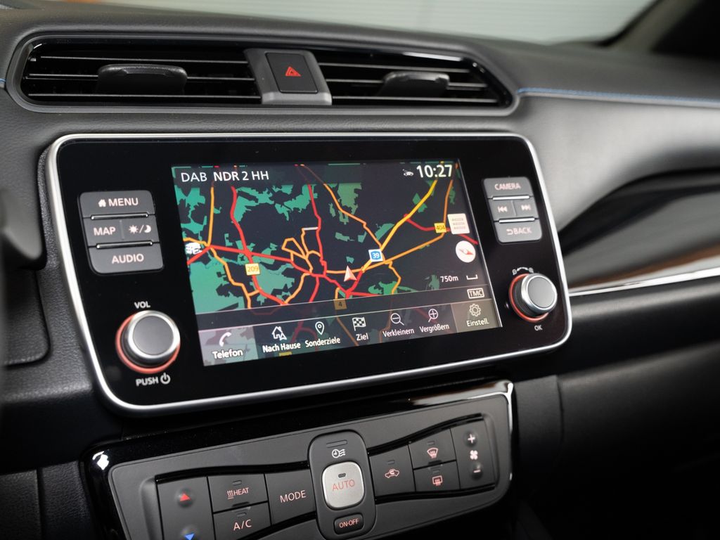- Ausstattungs-Paket: Nissan Connect EV: Radioempfang digital (DAB), USB-Schnittstelle, AUX-IN-Anschluss (AUX-IN), 6 Lautsprecher, Freisprechanlage Bluetooth, Navigationssystem, Touchscreen-Farbdisplay (7,0 Zoll) in Mittelkonsole, Audiosystem: Radio mit MP3-Wiedergabefunktion