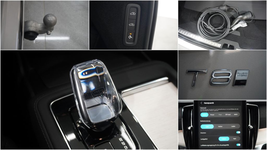 3.Sitzreihe, Airbag Beifahrerseite, Airbag Beifahrerseite abschaltbar, Airbag Fahrerseite, Ambiente-Beleuchtung, Anhänger-Stabilisierungs-Programm (TSA) Vorbereitung, Antriebsart: Allradantrieb, Applikationen am Fahrzeugheck Hochglanz-Schwarz, Applikationen an den Seitenfenstern schwarz, hochglänzend, Armaturenbrett in Leder-Optik mit Kontrastnaht, Außen-/Innenspiegel mit Abblendautomatik, Außenspiegel elektr. anklappbar, Außenspiegel elektr. verstell- und heizbar, Außenspiegel schwarz, hochglänzend, Außentemperaturanzeige, Beinauflage elektr. verstellbar, Sitze vorn, Betätigung Heckklappe/-Deckel automatisch, Blinkleuchten LED in Außenspiegel integriert, Bordcomputer, Bremsenergierückgewinnung, Dachhimmel und Türsäulen Nubuk - Textil, Dachreling schwarz, hochglänzend, Digitale Instrumentierung 12,3"-Display, Einparkhilfe vorn und hinten (hinten mit Bremsfunktion), Elektromotor 107 kW (Hybridantrieb), Elektron. Differentialsperre Corner Traction Control (CTC) mit Torque Vectoring, Erste Hilfe-Kasten / Verbandkasten, Exterieurumfänge lackiert, Fahrassistenz-Paket: Driver Assistance, Fahrassistenz-Paket: Driver Awareness, Fahrassistenz-Paket: Safety Assistance, Fahrassistenz-System: Bergabfahrkontrolle (HDC), Fahrassistenz-System: Berganfahr-Assistent (HSA), Fahrassistenz-System: Fahrprofilauswahl (Drive Mode), Fahrassistenz-System: Intelligent Speed Assist (ISA), Fahrassistenz-System: Multikollisionsbremse (Multi Collision Brake), Fensterheber elektrisch vorn + hinten, Gepäckraum-Abtrennung (Netz), Gepäckraumabdeckung / Rollo, Getriebe Automatik - Geartronic (8-Stufen), Head-up-Display, Heckscheibe heizbar, Hybrid 335 kW (Motor 2,0 Ltr. - 228 kW), Induktionsladeschale für Smartphone, Infotainment-System: Android (DAB+), Innenausstattung: Dekoreinlagen Echtholz Brown Ash, Innenraumfilter: Pollenfilter, Ionisator zur Luftreinigung (erweiterte Reinigung der Innenraumluft), Isofix-Aufnahmen für Kindersitz, Karosserie: 5-türig, Kindersicherung elektr. betätigt, Kindersitz integriert (2.Sitzreihe mitte), Klimaautomatik 4-Zonen, Knieairbag Fahrerseite, Kopf-Airbag-System, Kopfstützen hinten elektr. umklappbar, Kühlergrill Iron Mark Dark Design, Ladekabel (7,0 m) mit Schukostecker (Mode 2), Ladekantenschutz (Aluminium), Lendenwirbelstützen vorn, elektr. verstellbar (4-Wege), Lenkrad mit Multifunktion, Lenksäule (Lenkrad) höhenverstellbar, Lenksäule (Lenkrad) längsverstellbar, Make-up-Spiegel beleuchtet, Matrix-LED-Scheinwerfer, Memoryfunktion für Sitz vorn rechts, Mittelarmlehne hinten, Modellpflege (2), Motorsound-System (Audible Vehicle Alert System, AVAS), One Pedal Drive (elektronisches Gaspedal), Otto-Partikelfilter (OPF), Parkbremse elektrisch, Radioempfang digital (DAB+), Radstand 2984 mm, Reifen-Reparaturset, Reifendruck-Kontrollsystem, Rückfahrkamera mit 360° Surround View, Rücksitzbank 3-teilig, Rücksitzlehnen klappbar, Schadstoffarm nach Abgasnorm Euro 6e, Schalt-/Wählhebelgriff Kristallglas, Schiebe-/Hebedach elektrisch (Glas), Schleudertrauma-Schutzsystem (WHIPS), Seitenairbag vorn, Sensor Scheibenbeschlagerkennung, Sicherheitsgurte vorn und hinten höhenverstellbar, Sitz vorn links elektr. verstellbar (mit Memory), Sitzbezug / Polsterung: Ledernachbildung Nordico, Anthrazit, Sitzheizung vorn, Smartphone Schnittstelle (Apple CarPlay), Sonnenschutzrollo an Seitenscheiben hinten, Standheizung elektrisch, Start/Stop-Anlage, Steckdose (12V-Anschluß) im Koffer-/Laderaum, Taschenhaken im Gepäckraum, Textilfussmatten, Textilfussmatten 3. Sitzreihe, USB-Anschluss (Typ C, 2-fach), USB-Anschlüsse (2) im Fond, USB-Ladeanschlüsse (2-fach, Typ C) für 3.Sitzreihe, Verglasung getönt, Volvo ON CALL, Warnanlage für Sicherheitsgurte vorn und hinten