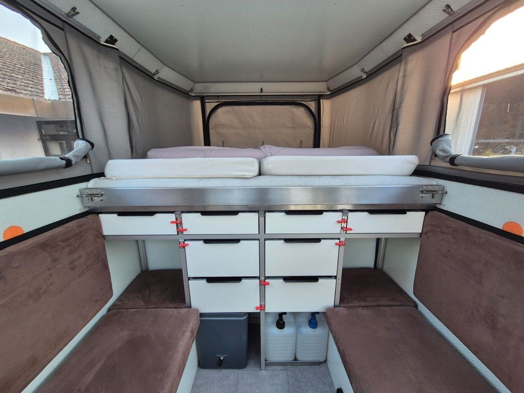Parallelhubdach mit vollsynchronisierten, via Kabel- und Funkfernbedienung steuerbaren Linearantrieben + Notbetrieb über Akkuschrauber möglich. Höhe Geschlossen 136 cm = Aufrechtes Sitzen und Nutzung Kabine problemlos möglich. Zelt vom Yachtsattler aus hochwertigem Marinestoff mit 4 großzügigen Öffnungen Moskitonetz + Abdunklung + 2 optional einsetzbare, klappbare Kunsstoffscheiben. Für kalte Nächte, zusätzliche Dämmbahnen aus Microfaser Vliesstoff. Ausziehbett 180 x 210 cm, Beide Sitzflächen sind zu 2 weiteren oder alternativen, vollwertigen Liegeflächen umbaubar. Dach geschlossen = 2 Schlafplätze / Dach offen 4 Schlafplätze. Fußloser Tisch einhängbar. Küchenblock mit soliden Vollauszügen / 40 L Kompressorkühlbox auf Vollauszug / Edelstahlspüle, 230 V und 12 V Steckdosen. Innenausbau, Regalsystem aus 20 mm Monopan Leichtbaumaterial wie Kabine. 8 Staukästen mit HPL Fronten. 3 x 20 Liter Frischwasserkanister. Tauchpumpe für Spülenarmatur. Große Zusatzarbeitsplatte Outdoor zum Einhängen. Neue unbenutzte Trevino Evo M Trockentrenntoilette. Dimmbare Beleuchtungen LED. USB B+C Steckdosen. 6 Kanal Schaltpaneel. Victron Smart Messhunt mit Anzeige sowie Bluetooth. Victron Smart 230 V 30 Ah Ladegerät + Victron Smart Solar Mppt. + 2 x flexible 100 w Solarzellen. 2 x Lifepo4 100 Ah, 1500 w Inverter. Autotherm Standheizung 2 kw.
