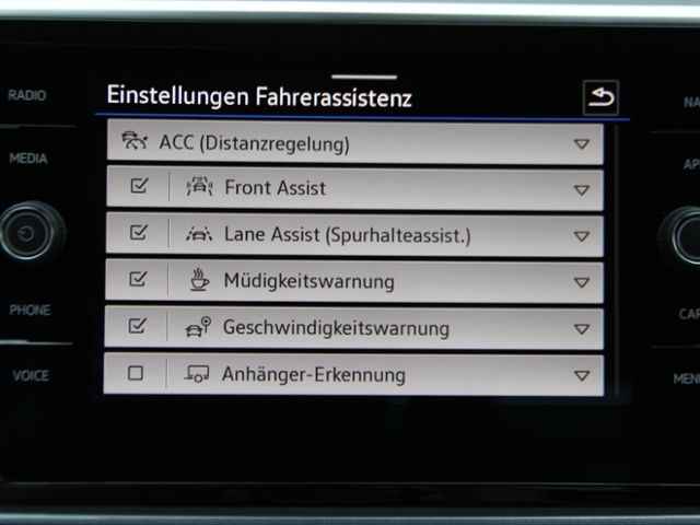 Berganfahrassistent; Rückfahrkamera; Spurhalteassistent; Mit Verkehrszeichenerkennung; Müdigkeitserkennung; Fernlichtassistent light assist; Abstandstempomat ACC; Parklenkassistent; Einparkhilfe Plus vorn und hinten; Regensensor; Automatische Fahrlichtschaltung; Front Assist; Notrufservice; Ablenkungserkennung