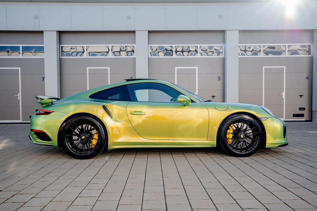 We are pleased to offer this extraordinary Porsche 991.2 Turbo S finished in the extremely rare ChromaFlair paint Python Green. This Porsche Exclusive Manufaktur paint is one of the most spectacular and exclusive finishes ever offered by Porsche. Thanks to special interference pigments, the color changes dramatically depending on light and viewing angle, shifting from vibrant green tones to gold and bronze reflections. The complex multi-layer paint process involved extensive manual craftsmanship and originally represented a surcharge in the region of €80,000-€100,000.