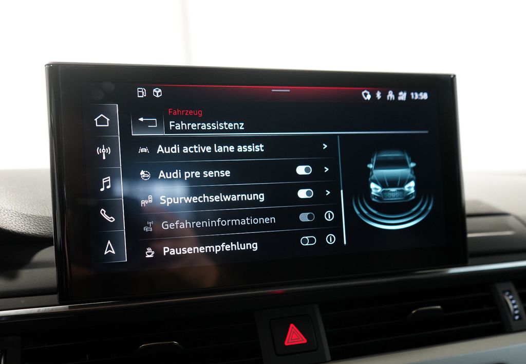 Sonderausstattung:Ablage- und Gepäckraum-Paket, Ambiente-Beleuchtung, Assistenz-Paket Fahren, Assistenz-Paket Parken, Außenspiegel elektr. verstell-, heiz- und anklappbar, mit Abblendautomatik und Memory, Bluetooth-Freisprecheinrichtung mit Spracherkennung (Audi Phone Box), Business-Paket, Dachhimmel Stoff, schwarz, Diebstahlsicherung für Räder (Felgenschlösser), Fzg. ohne Leichtlaufreifen, Gepäckraumklappe elektr. betätigt (öffnen + schliessen), Kombiinstrument digital (virtual cockpit plus), Komfort-Paket Sitze, Kraftstofftank: 54 Ltr., Metallic-Lackierung, Sitze vorn elektr. verstellbar (links mit Memory), Sound-System DSP / Audi Sound-System, Verglasung hinten abgedunkelt (Privacyverglasung)