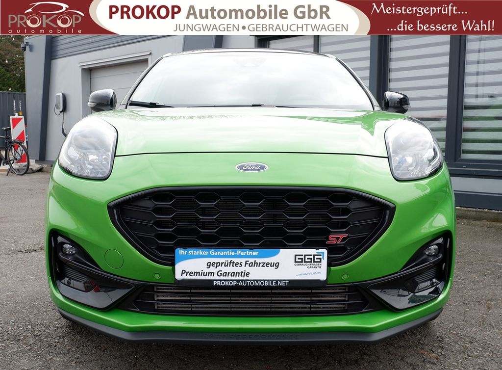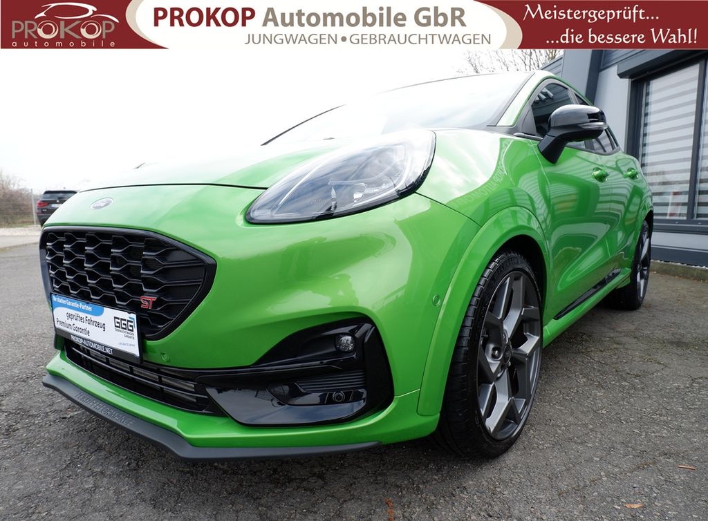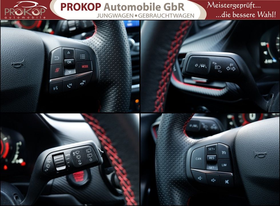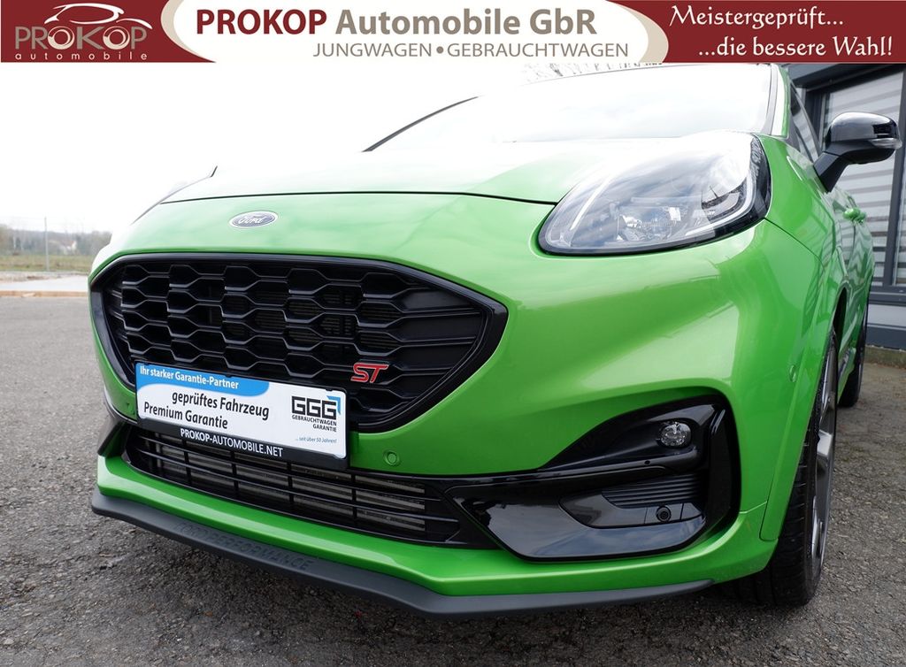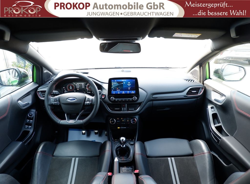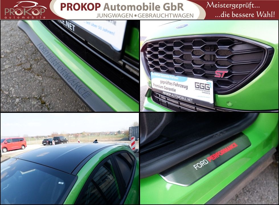 Ambiente-Beleuchtung vorn (LED), Antischlupfregelung (ASR), Audio-Navigationssystem Ford mit AppLink, Außenspiegel elektr. anklappbar, Außenspiegel elektr. verstell- und heizbar, Body-Styling-Paket, Dach andersfarbig lackiert / Kontrastfarbe, Dachhimmel Stoff, dunkel, Dachspoiler (große Ausführung) schwarz lackiert, Doppelendrohr Auspuffanlage, Eco-Anzeige für verbrauchsoptimiertes Fahren (EcoCoach), Einparkhilfe hinten, Fahrassistenz-System: Berganfahr-Assistent (Hill-Holder), Fahrassistenz-System: Falschfahrer-Warnfunktion, Fahrassistenz-System: Fernlichtassistent (Scheinwerfer mit Abblendautomatik), Fahrassistenz-System: Notbrems-Assistent, Fahrassistenz-System: Post-Collision-System, Fahrassistenz-System: Pre-Collision-System, Fahrassistenz-System: Spurhalteassistent mit Müdigkeitserkennungs-Sensor, Fahrassistenz-System: Totwinkel-Assistent, Cross Traffic Alert und Notbremsfunktion, Fahrassistenz-System: Verkehrsschildassistent, Farbdisplay für Bordcomputer, Fensterheber elektrisch vorn + hinten mit Komfortschließung, FordPass Connect inkl. eCall, Fußmatten ST-Design, Heckleuchten LED, Innenraumfilter: Staub- und Pollenfilter, Innenspiegel mit Abblendautomatik, Intelligent Protection System (IPS), Intelligenter Geschwindigkeits-Begrenzer, Isofix-Aufnahmen für Kindersitz, Karosserie: 5-türig, Kombiinstrument Digitalanzeige 12,3 Zoll, Kopfstützen hinten mechan. verstellbar (3 Stück), Laderaumboden variabel (Ford Megabox), Lendenwirbelstütze vorn, Lenkrad (Sport/Leder, ST), Lenksäule (Lenkrad) höhen-/längsverstellbar, LM-Felgen, Motor 1,5 Ltr. - 147 kW EcoBoost KAT, My Key (2. Fahrzeugschlüssel programmierbar), Nebelscheinwerfer LED, Otto-Partikelfilter (OPF), Parkpilotsystem vorn, Pedale Aluminium, Radstand 2588 mm, Reifen-Reparaturkit, Reifendruck-Kontrollsystem, Rücksitzlehne geteilt/klappbar (60:40), Schadstoffarm nach Abgasnorm Euro 6d, Scheinwerfer LED, Scheinwerfer-Assistent mit Tag-/Nachtsensor, Sonnenblende links mit Spiegel (beleuchtet), Sonnenblende rechts mit Spiegel (beleuchtet), Sport-Fahrwerk mit Spezial-Radaufhängung, Sportsitze vorn (Recaro) Teilleder, Start/Stop-Anlage, Türgriffe außen Wagenfarbe, Verglasung hinten abgedunkelt (Privacy Glass), Innenspiegel automatisch abblendend, Geschwindigkeitsbegrenzer mit vorausschauender Regelung, Regensensor