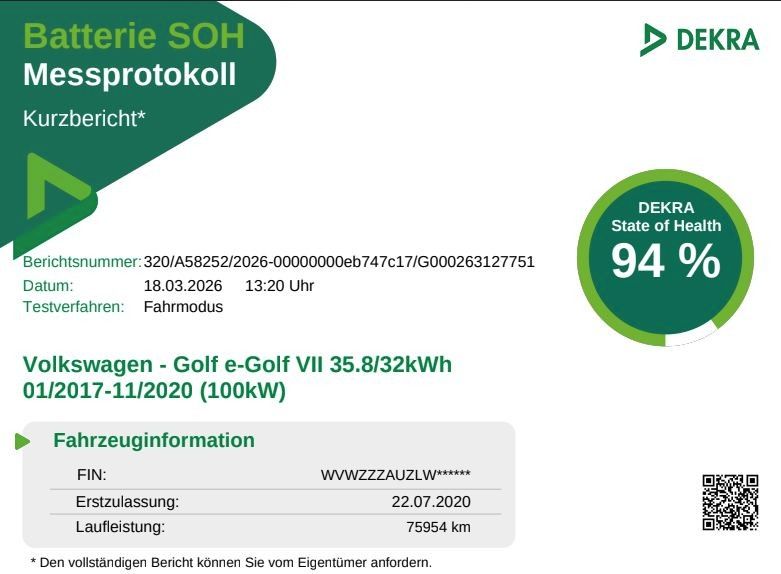 Verkaufe meinen zuverlässigen und gepflegten VW e-Golf aus dem letzten und technisch ausgereiftesten Modelljahr 2020. Das Auto ist der perfekte, kostengünstige Alltagsbegleiter und funktioniert technisch einwandfrei.Ein aktuelles, unabhängiges DEKRA Batteriezertifikat liegt vor und bescheinigt den hervorragenden Zustand des Akkus (State of Health: 94 %).