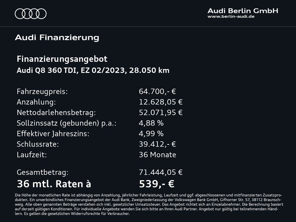 - Anbieterbank: Audi Bank - Zweigniederlassung der Volkswagen Bank GmbH / Gifhorner Str. 57 / 38112 Braunschweig