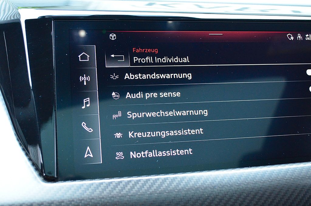 Sonderausstattung:Akustikglas Türscheiben seitlich, Assistenz-Paket plus, Außenspiegel Wagenfarbe, Bluetooth-Freisprecheinrichtung mit Spracherkennung (Audi Phone Box), Design-Paket: RS rot, Dynamiklenkung - Allradlenkung, Fahrassistenz-System: Adaptiver Fahrassistent mit Notfall-Assistent, Frontscheibe Klimakomfort / Akustikglas, Head-up-Display, Innenausstattung: Dekoreinlagen Carbon Köper, Ionisator zur Luftreinigung (Air-Quality-System), Komfortschlüssel mit sensorgesteuerter Heckklappenentriegelung und Diebstahl-Warnanlage inkl. (öffnen + schliessen), Kühlergrill Single-Frame-Optik in Wagenfarbe, LM-Felgen vorn/hinten: 9,5x21 / 11,5x21 (10-Speichen-Trapezmodul, schwarz, glanzgedreht), Matrix-LED-Scheinwerfer mit Laserlicht, Metallic-Lackierung, Optik-Paket schwarz plus, Sender für Garagentoröffner (integriert), Servolenkung elektro-mechanisch plus, Sitzbelüftung und Massagefunktion vorn, Sportsitze pro vorn, Stahlbremsanlage mit Wolframcarbid, Bremssättel rot, Verglasung hinten abgedunkelt (Privacyverglasung)